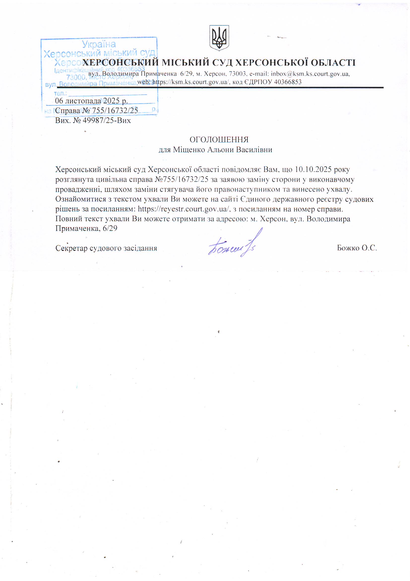 Оголошення для Міщенко Альони Василівни про винесення ухвали