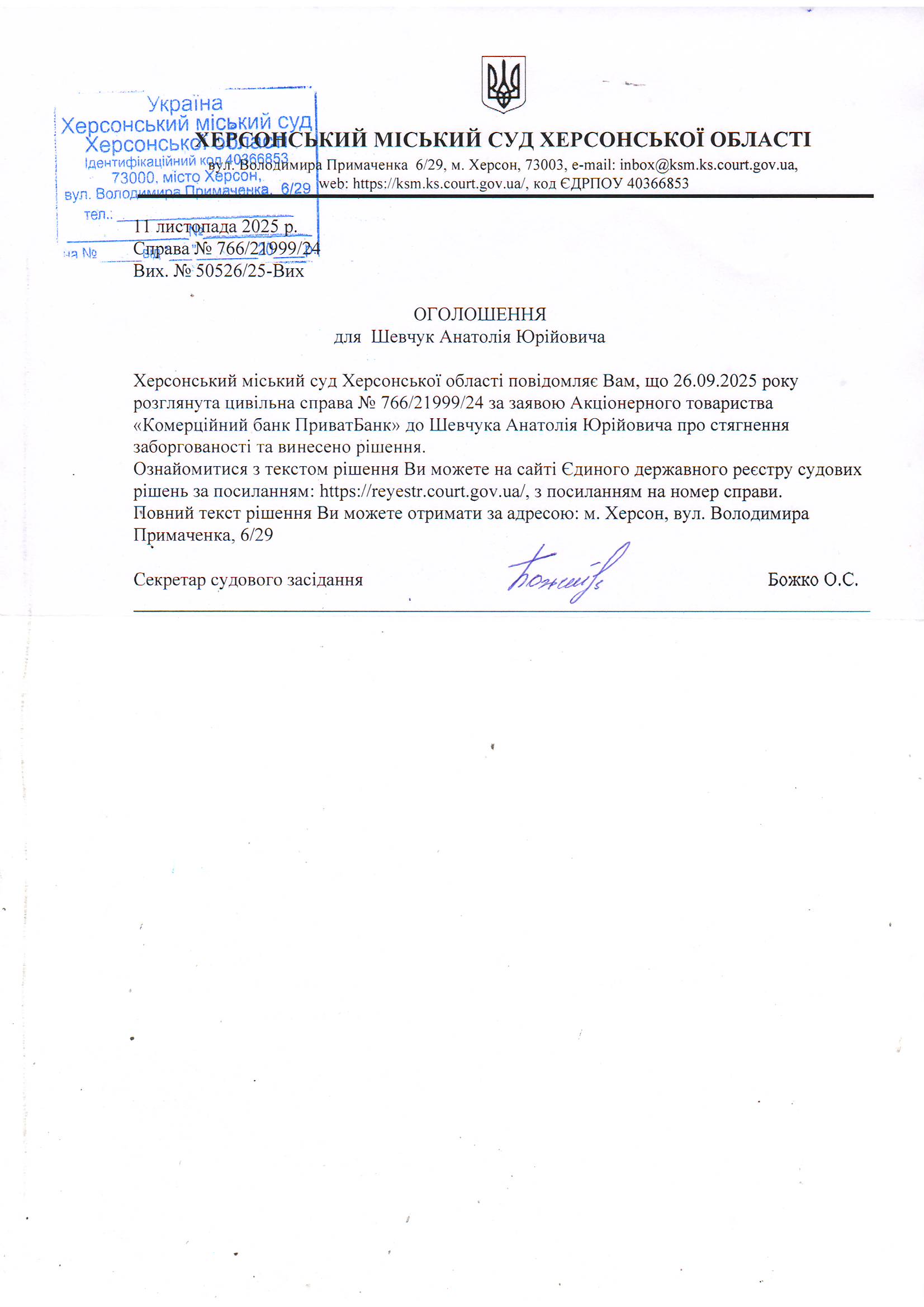 Оголошення для Шевчука Анатолія Юрійовича про винесення рішення