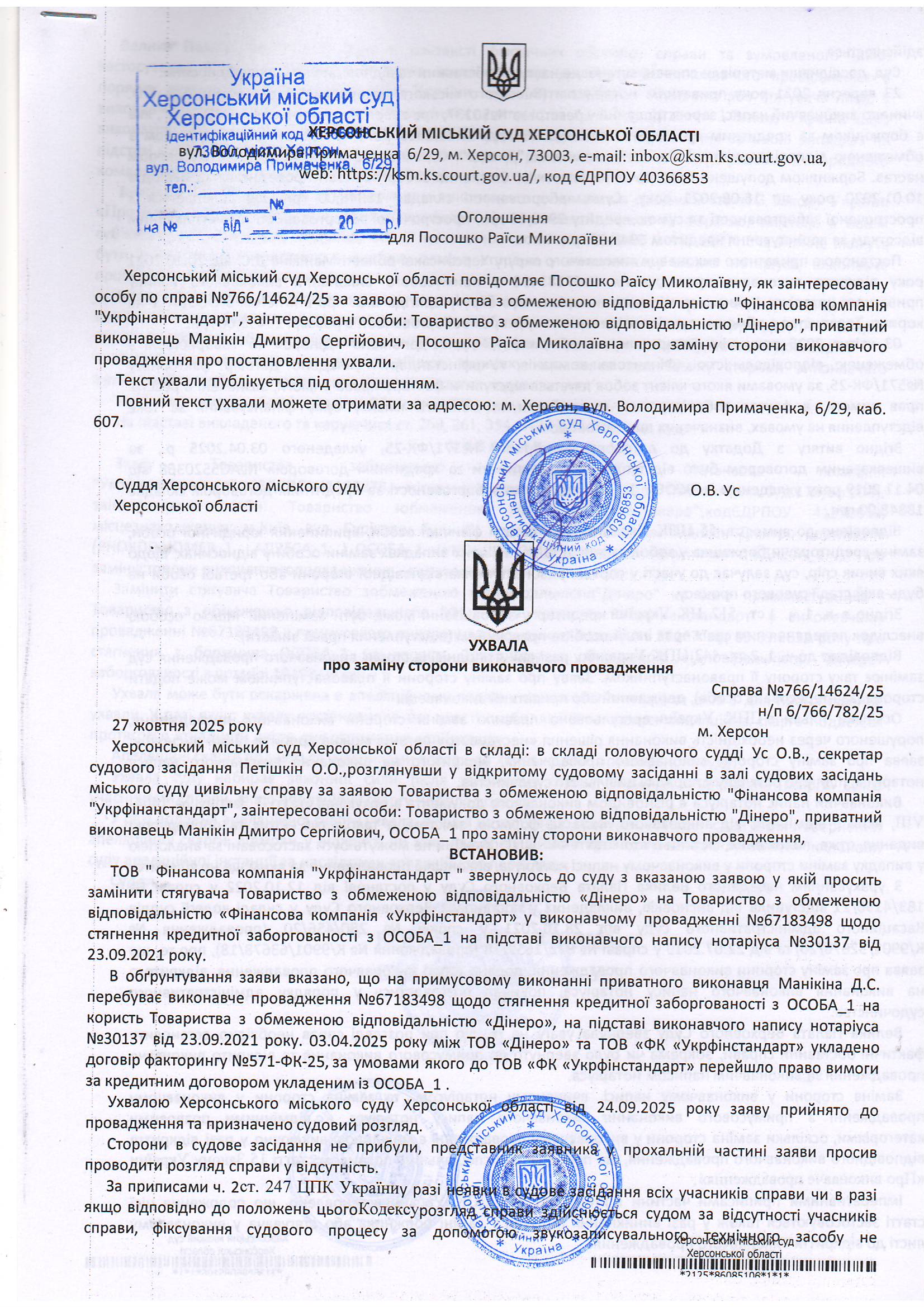 ОГОЛОШЕННЯ, УХВАЛИ ТА ЗАОЧНІ РІШЕННЯ