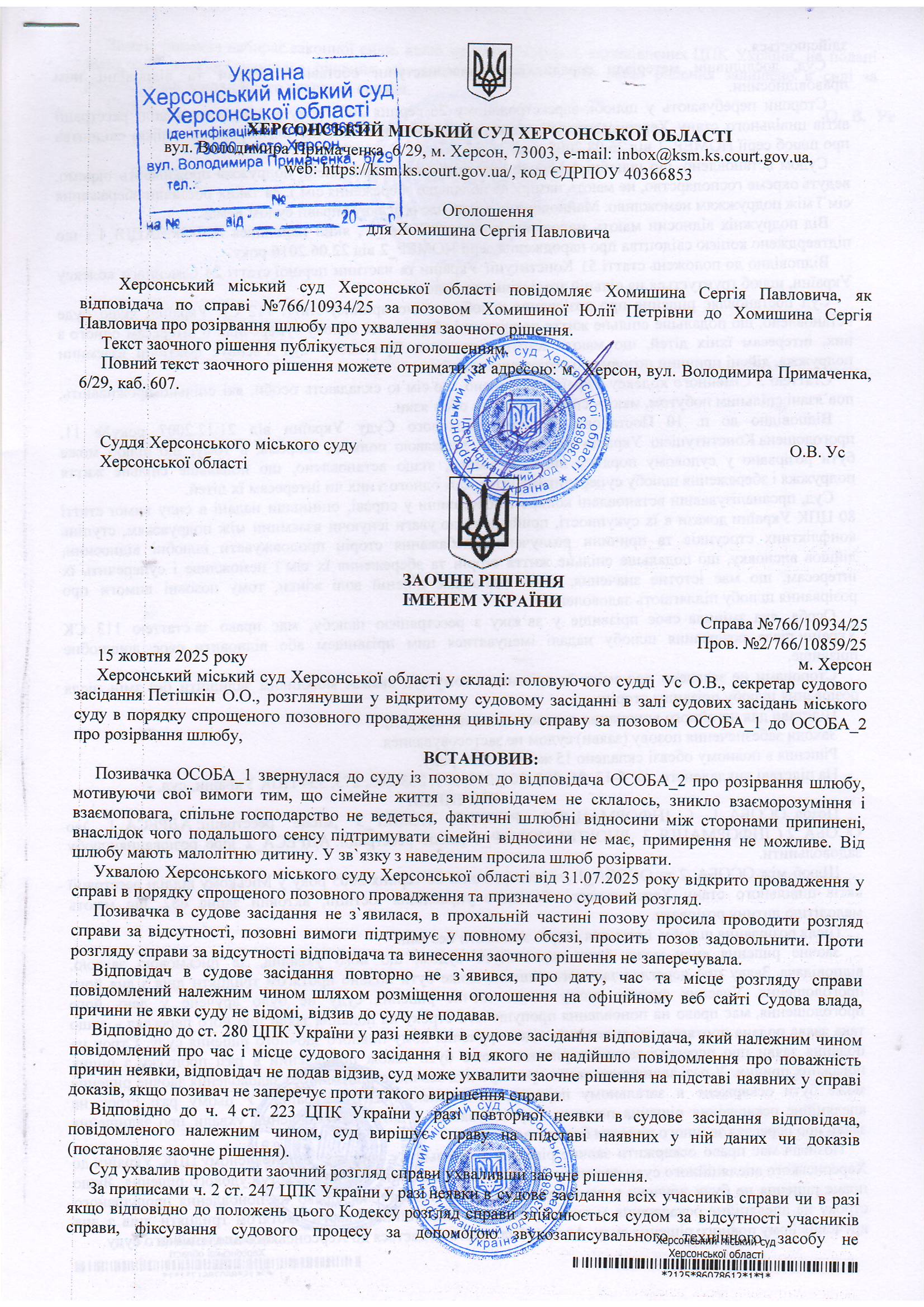 ОГОЛОШЕННЯ, УХВАЛИ ТА ЗАОЧНІ РІШЕННЯ