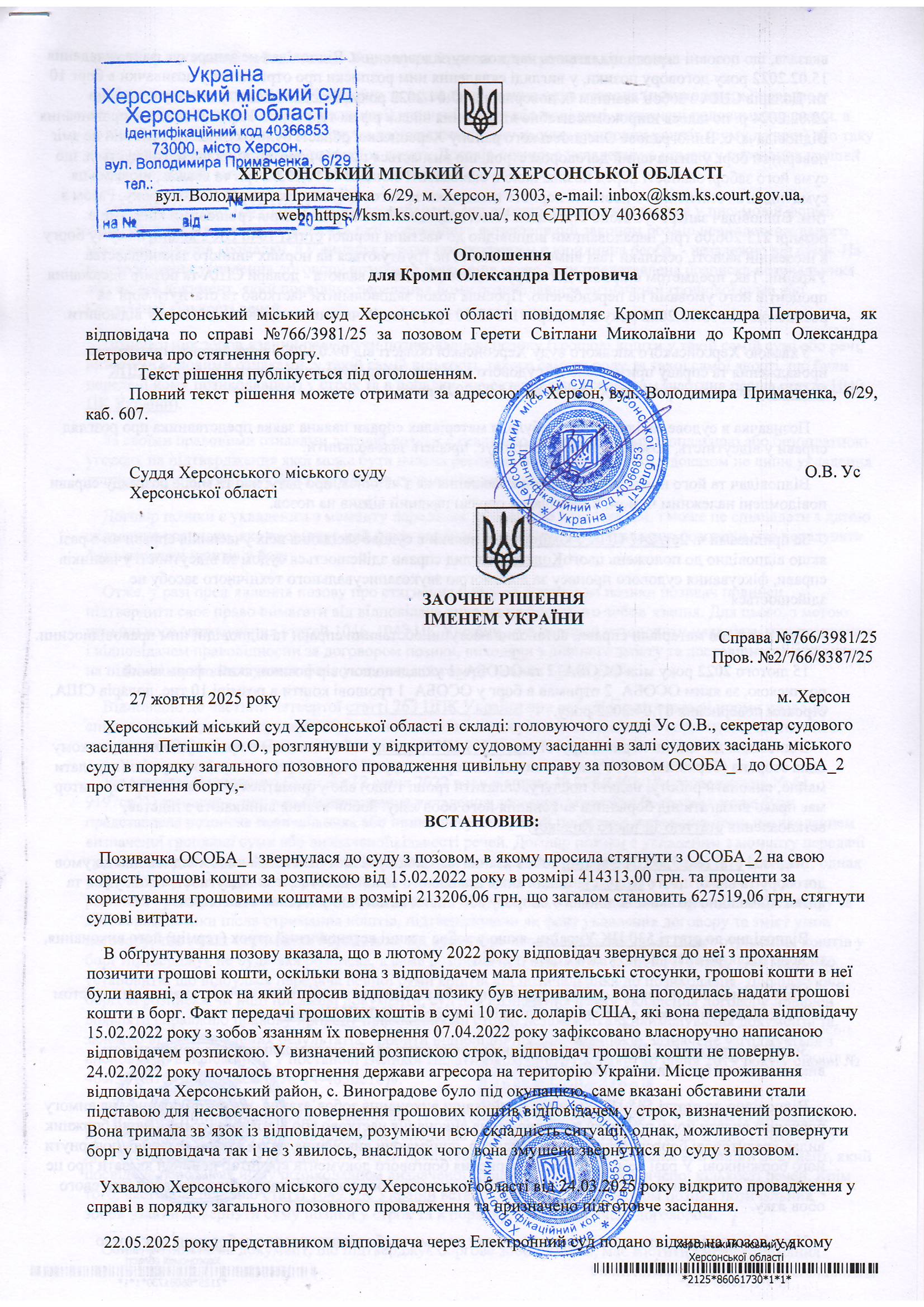 ОГОЛОШЕННЯ, УХВАЛИ ТА ЗАОЧНІ РІШЕННЯ
