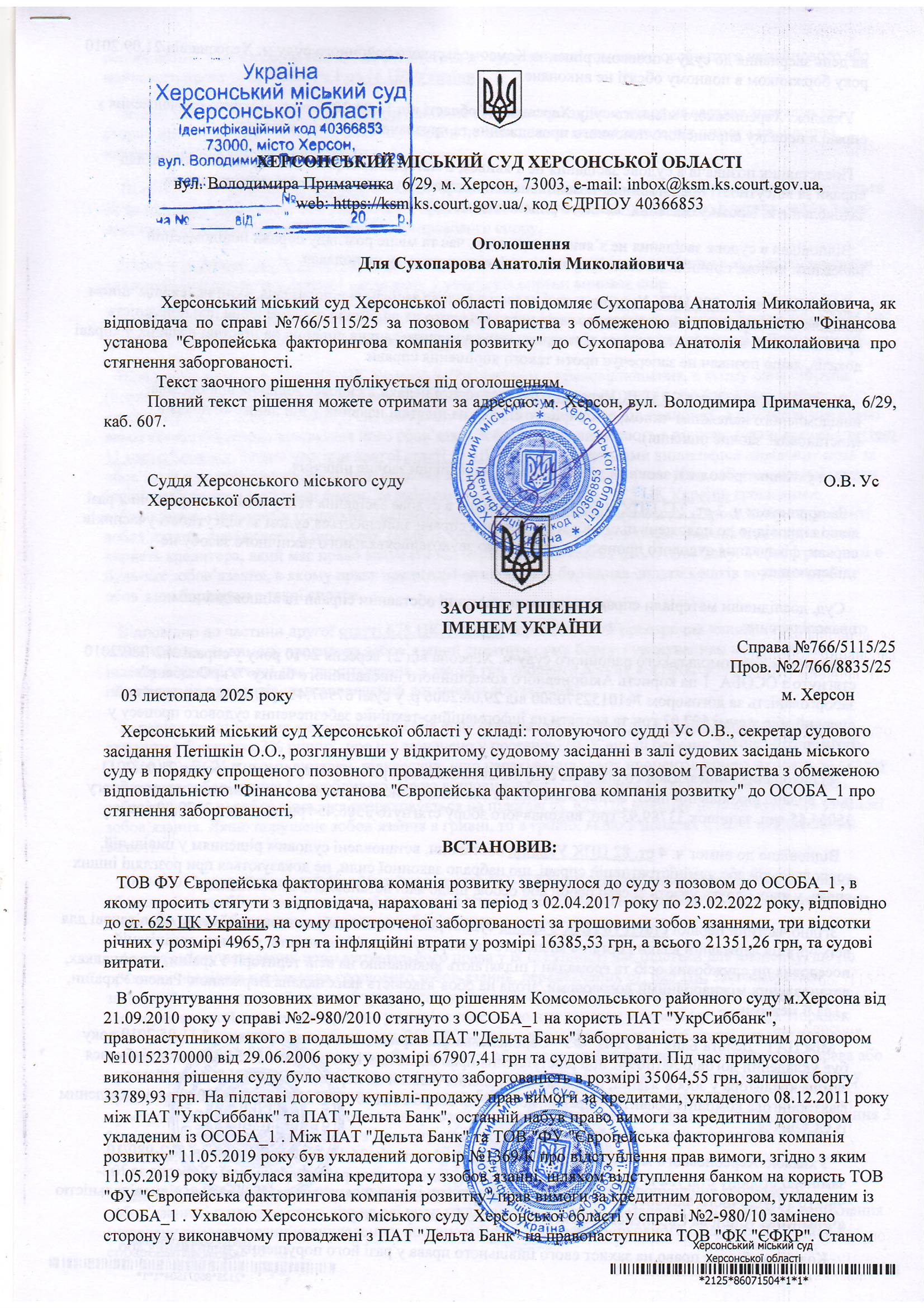ОГОЛОШЕННЯ, УХВАЛИ ТА ЗАОЧНІ РІШЕННЯ