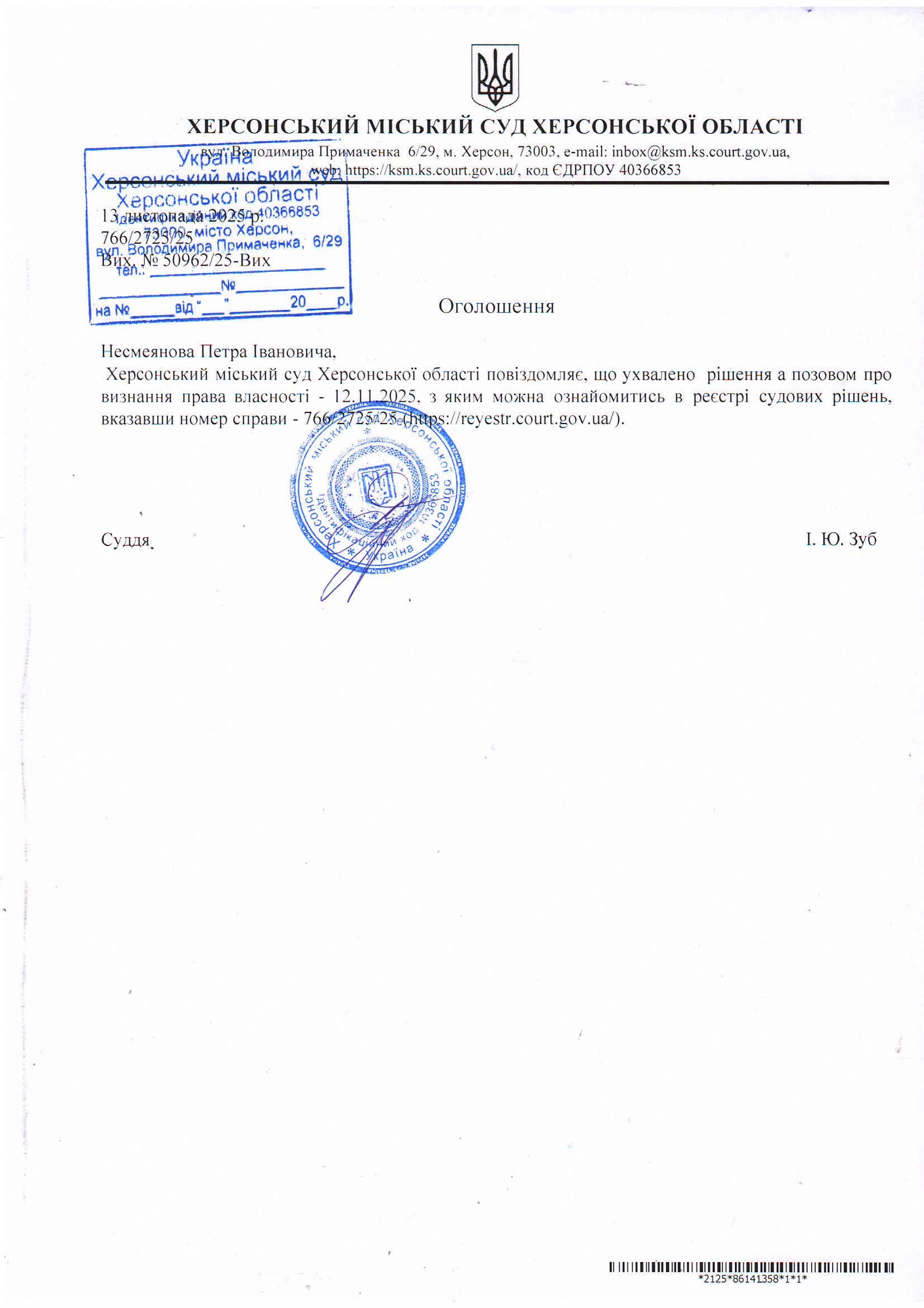 Оголошення для Несмеянова Петра Івановича про ухвалення рішення