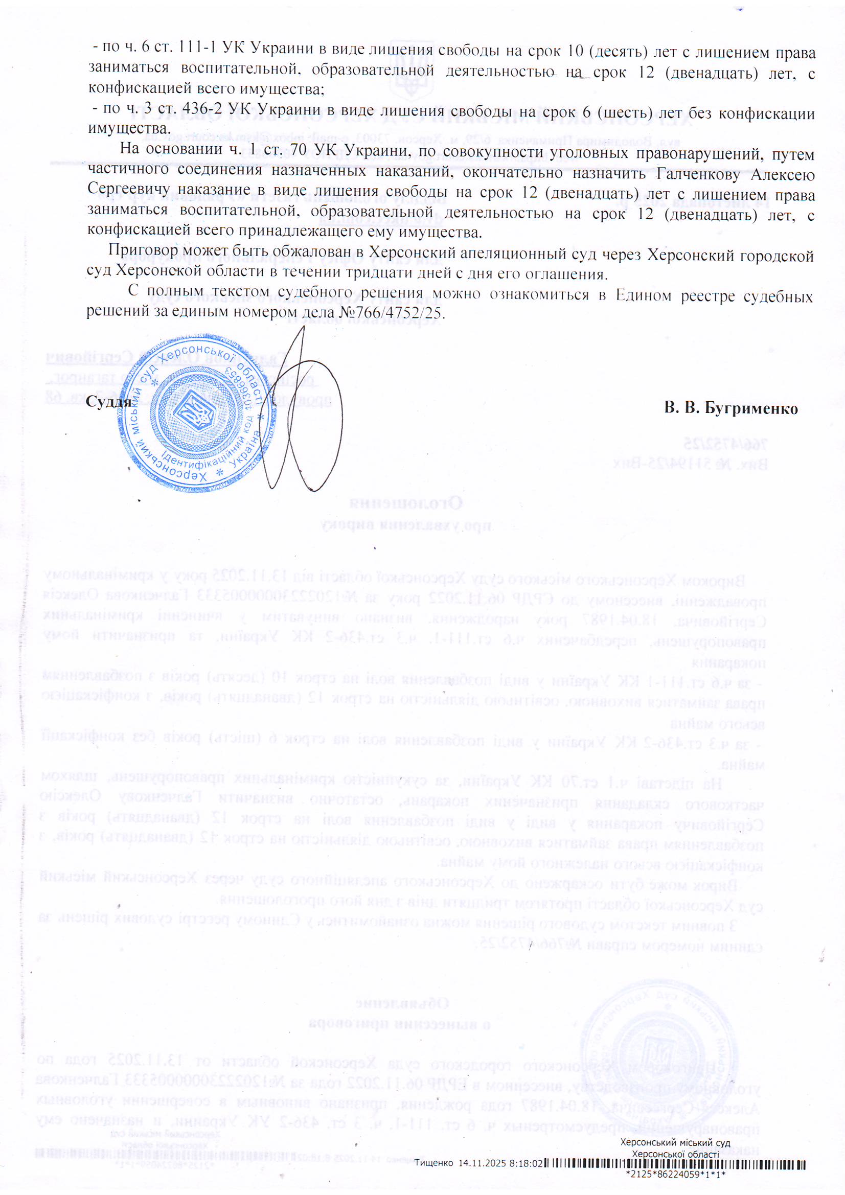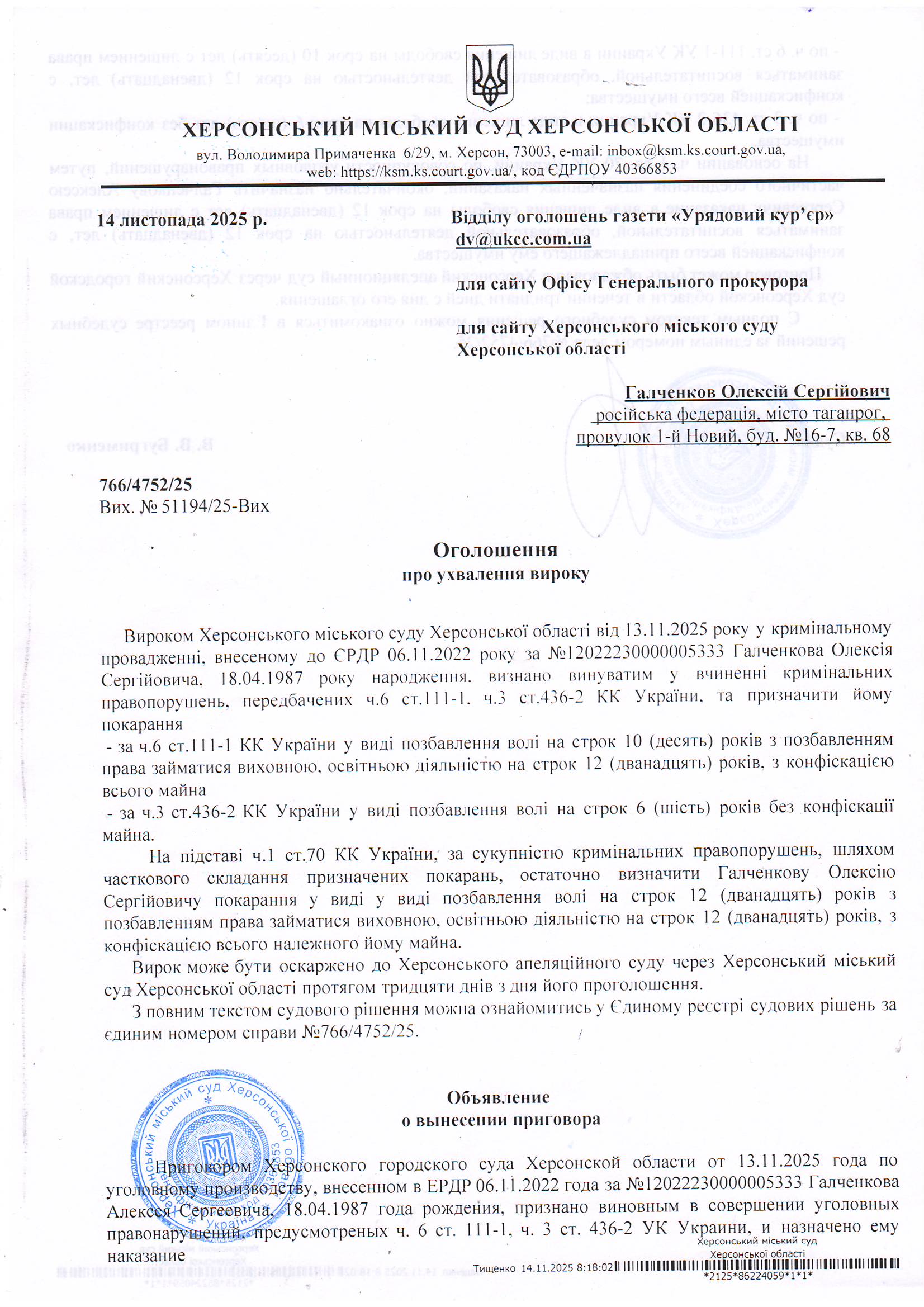 Оголошення для Галченкова Олексія Сергійовича про ухвалення вироку