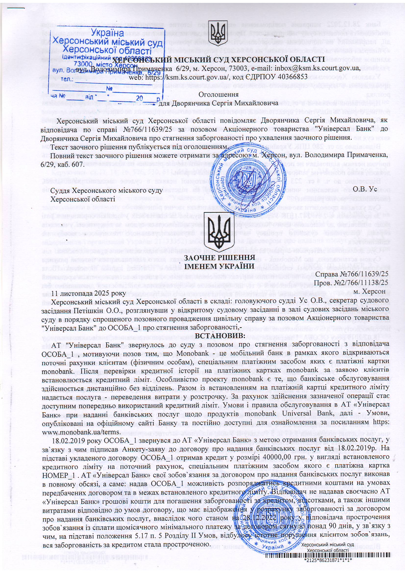 ОГОЛОШЕННЯ, УХВАЛИ ТА ЗАОЧНІ РІШЕННЯ