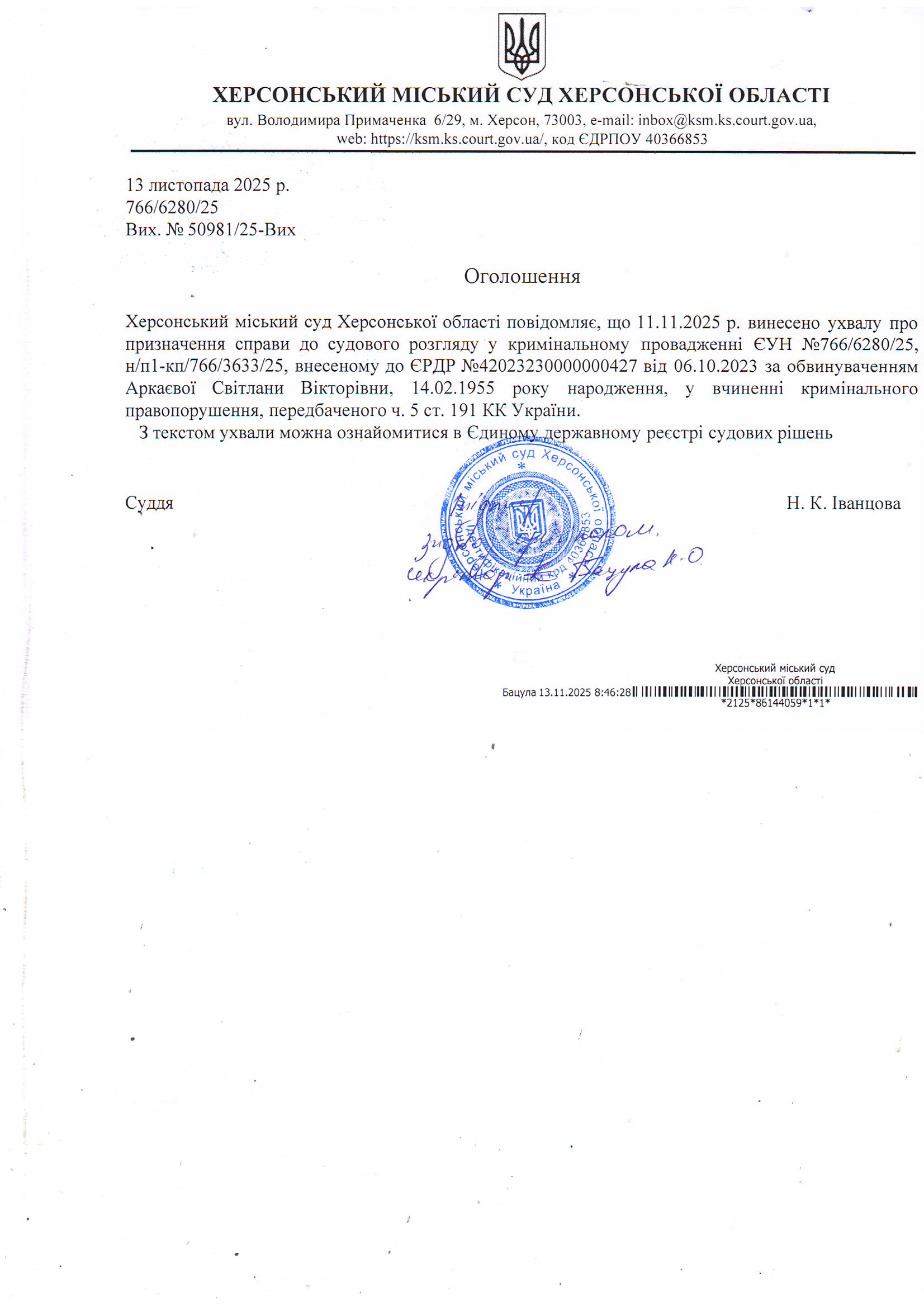 Оголошення для Аркаєвої Світлани Вікторівни про винесення ухвали