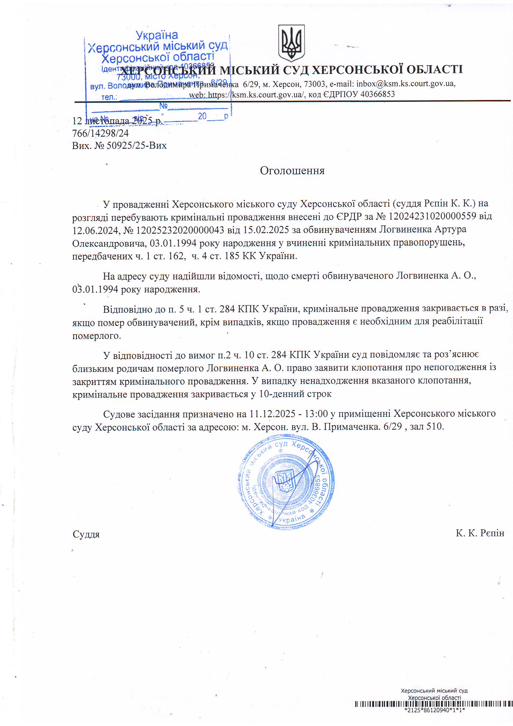 Оголошення про закриття кримінального провадження у відношенні Логвиненка Артура Олександровича