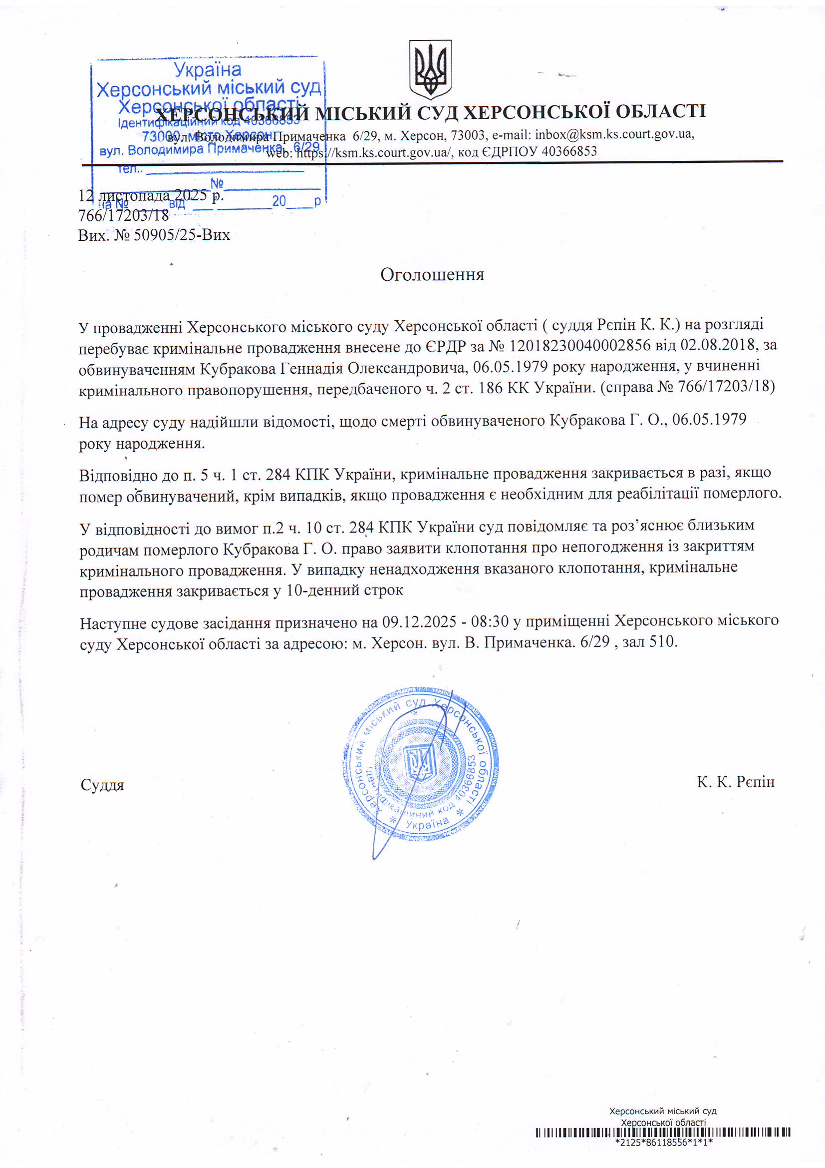 Оголошення про закриття кримінального провадження у відношенні Кубракова Геннадія Олександровича