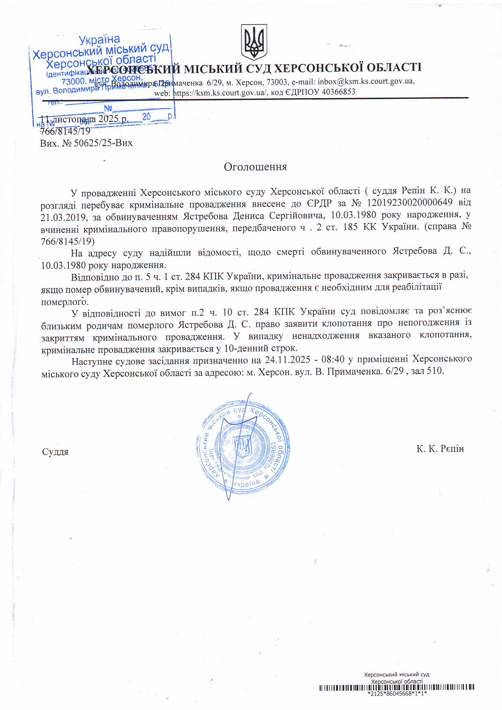 Оголошення про закриття кримінального провадження у відношенні Ястребова Дениса Сергійовича