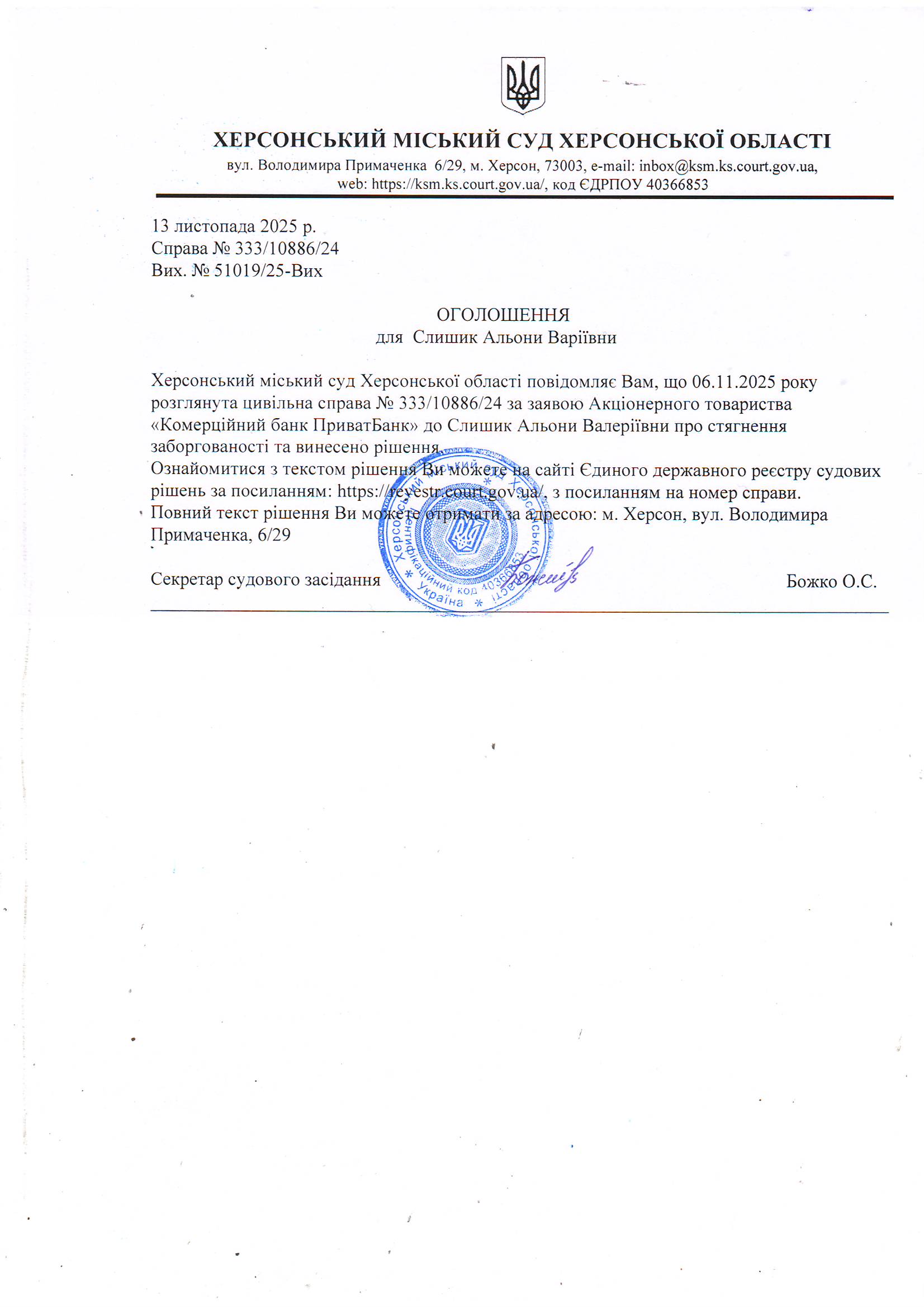 Оголошення для Слишик Альони Валеріївни про винесення рішення