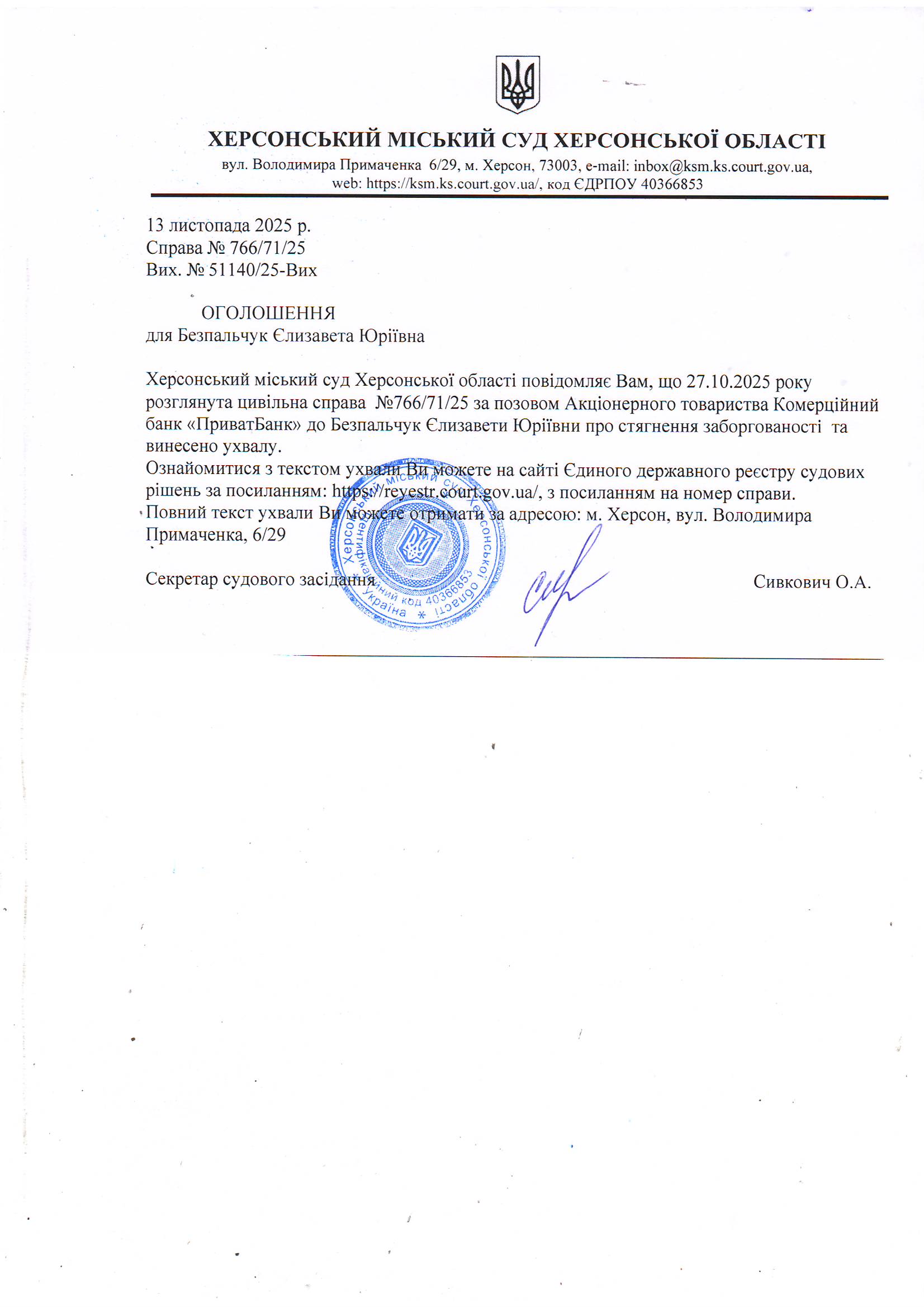 Оголошення для Безпальчук Єлизаввети Юріївни про винесення ухвали