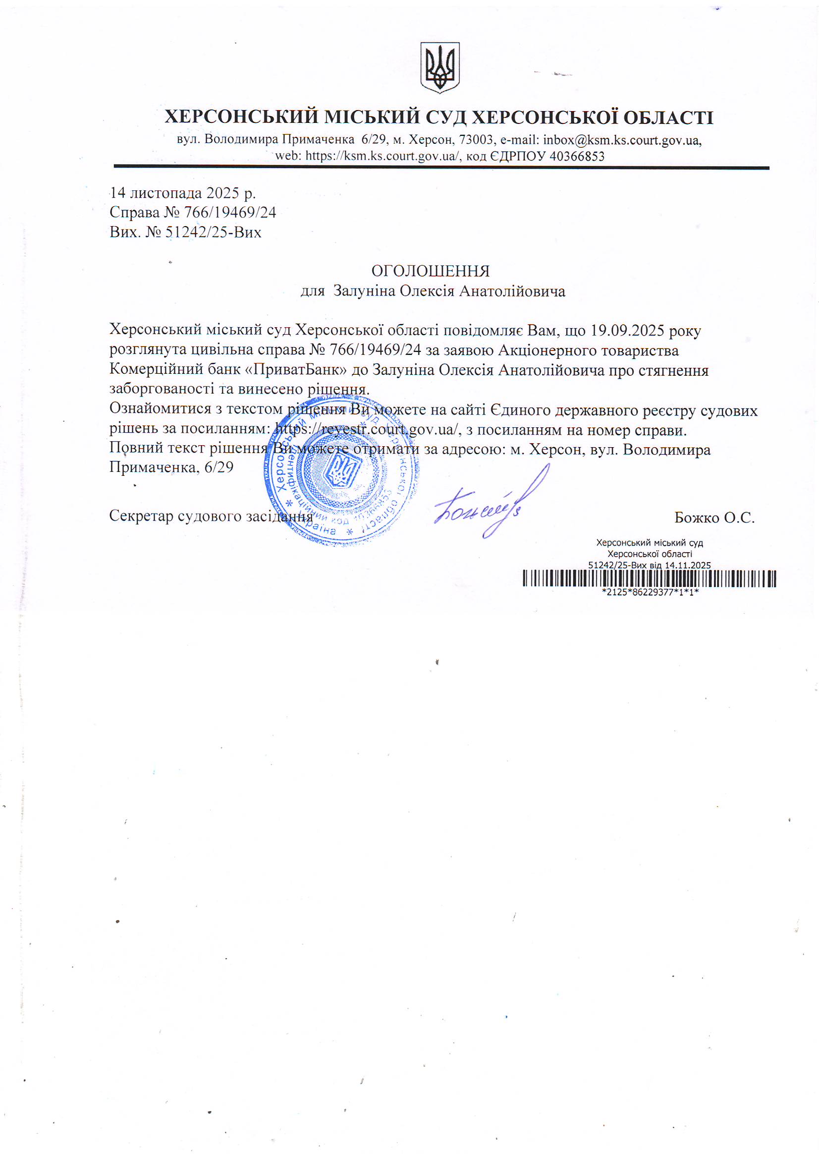 Оголошення для Залуніна Олексія Анатолійовича про винесення рішення