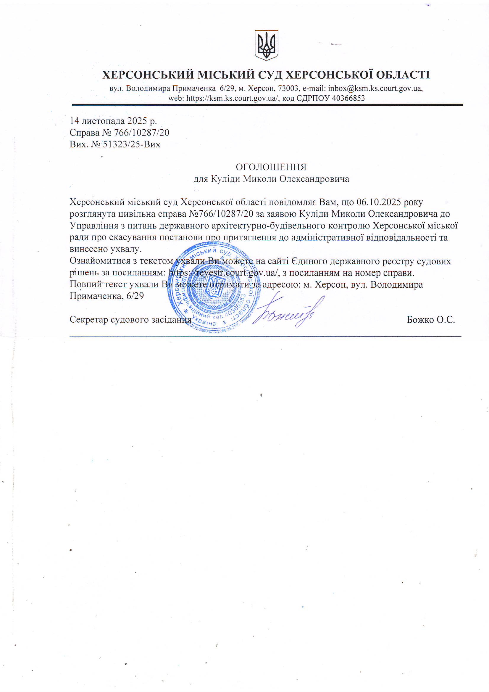 Оголошення для Куліди Миколи Олександровича про винесення ухвали