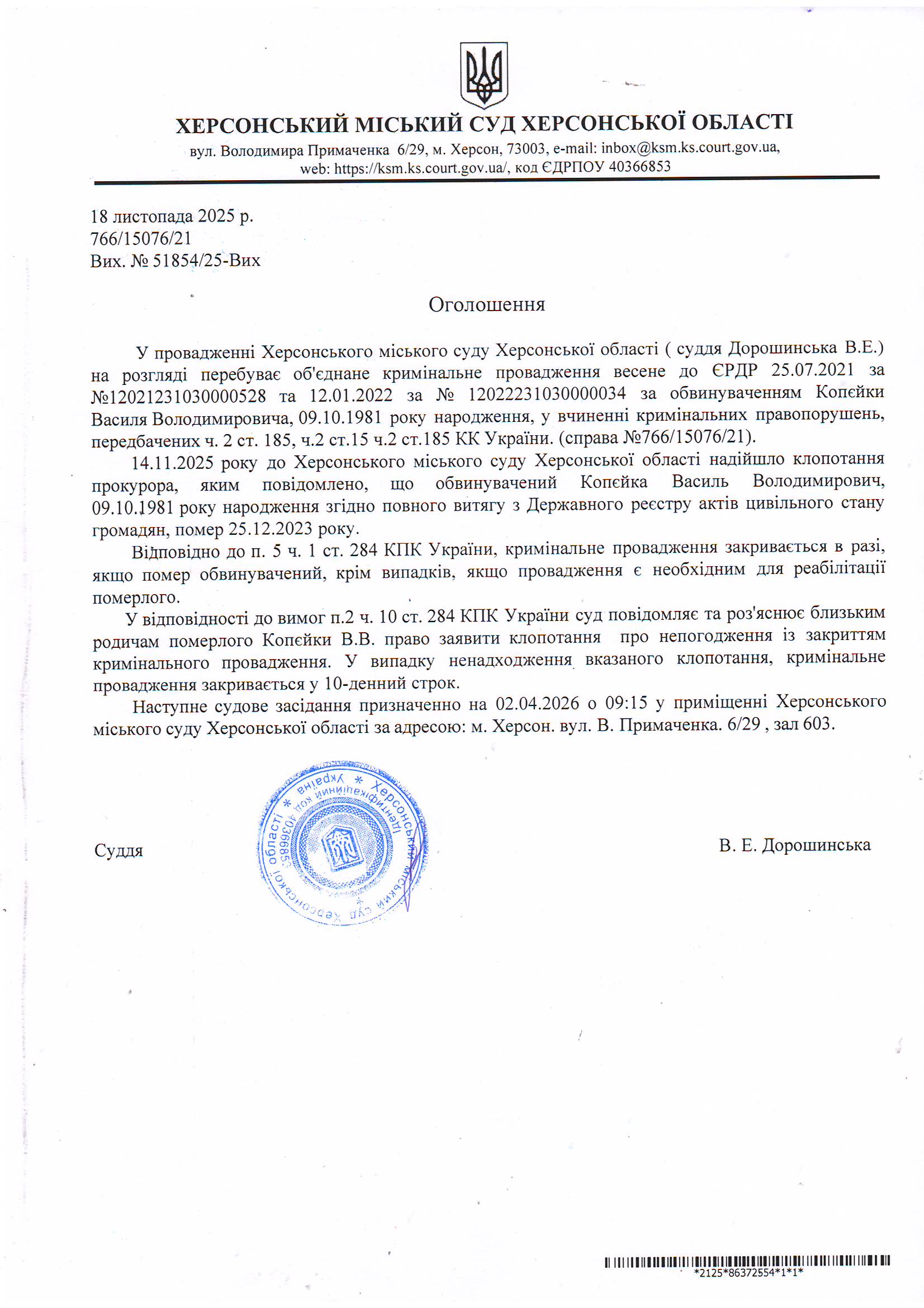 Оголошення про закриття кримінального провадження у відношенні Копєйки Василя Володимировича