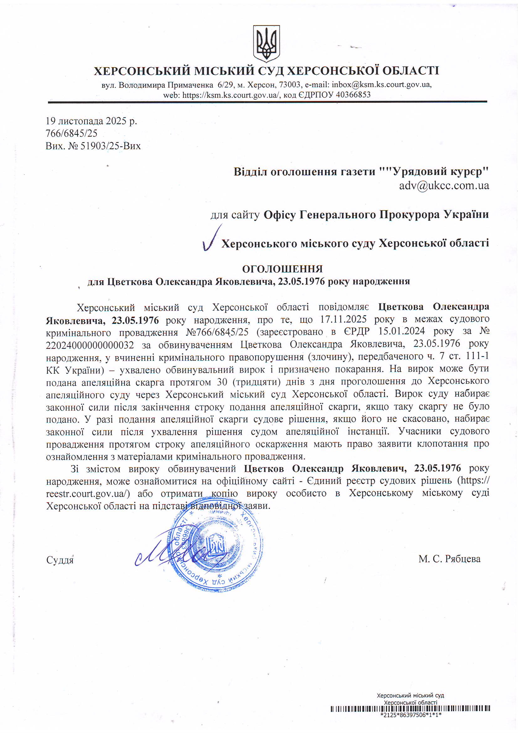 Оголошення для Цветкова Олександра Яковлевича про винесення вироку