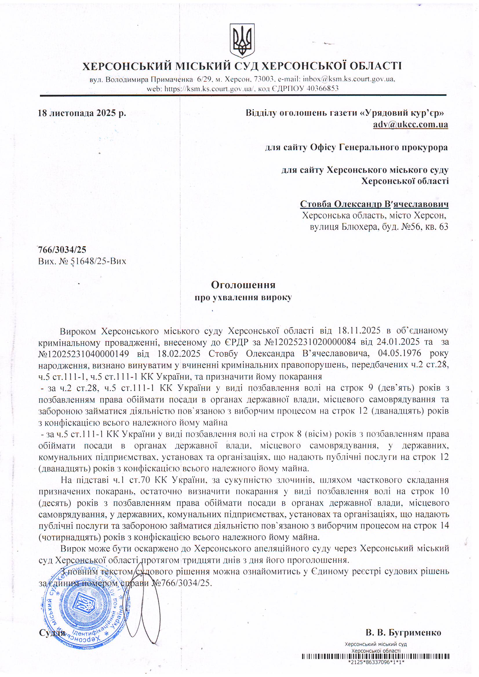 Оголошення для Стовби Олександра В'ячеславовича про винесення вироку