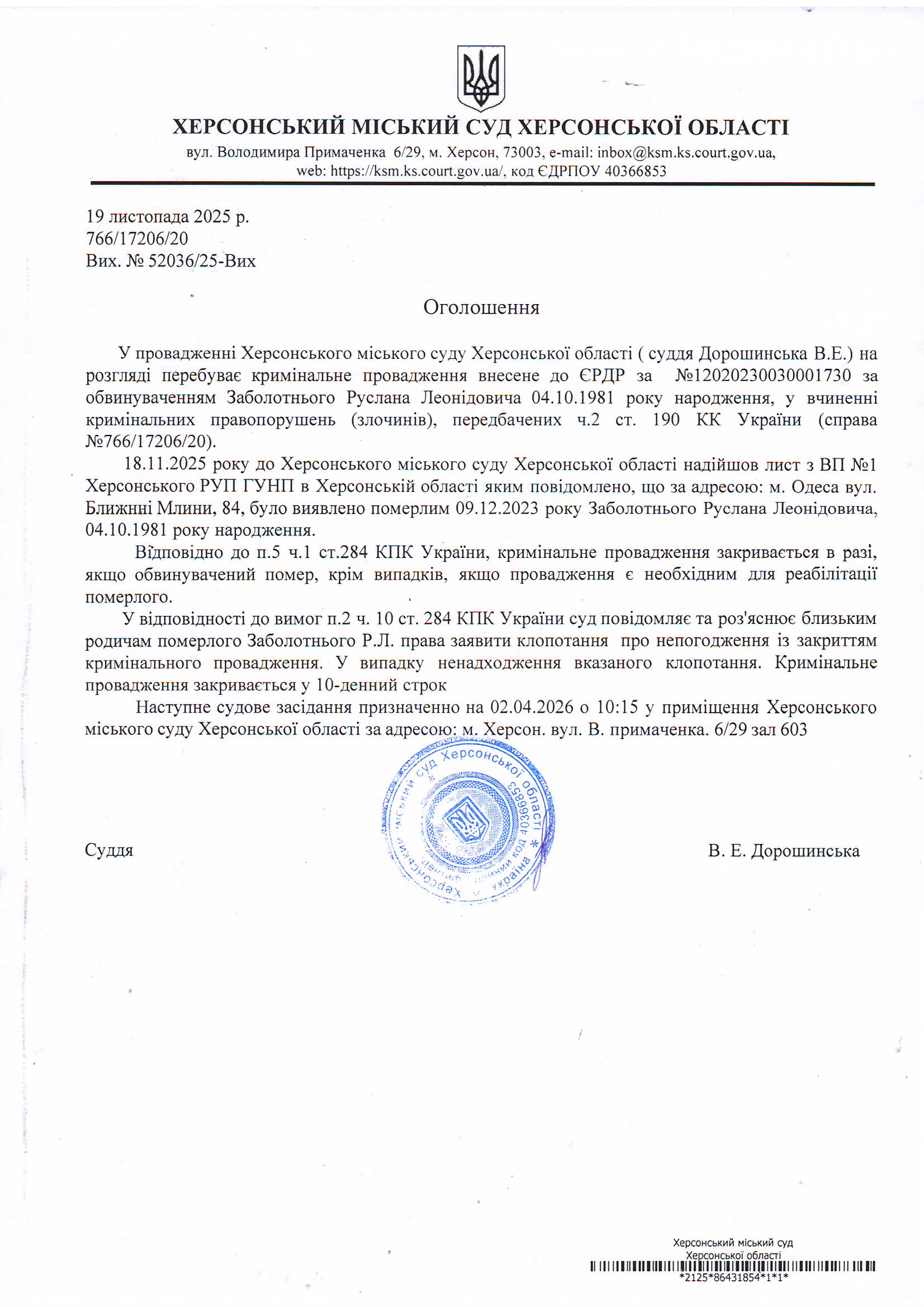 Оголошення про закриття кримінального провадження у відношенні Заболотнього Руслана Леонідовича