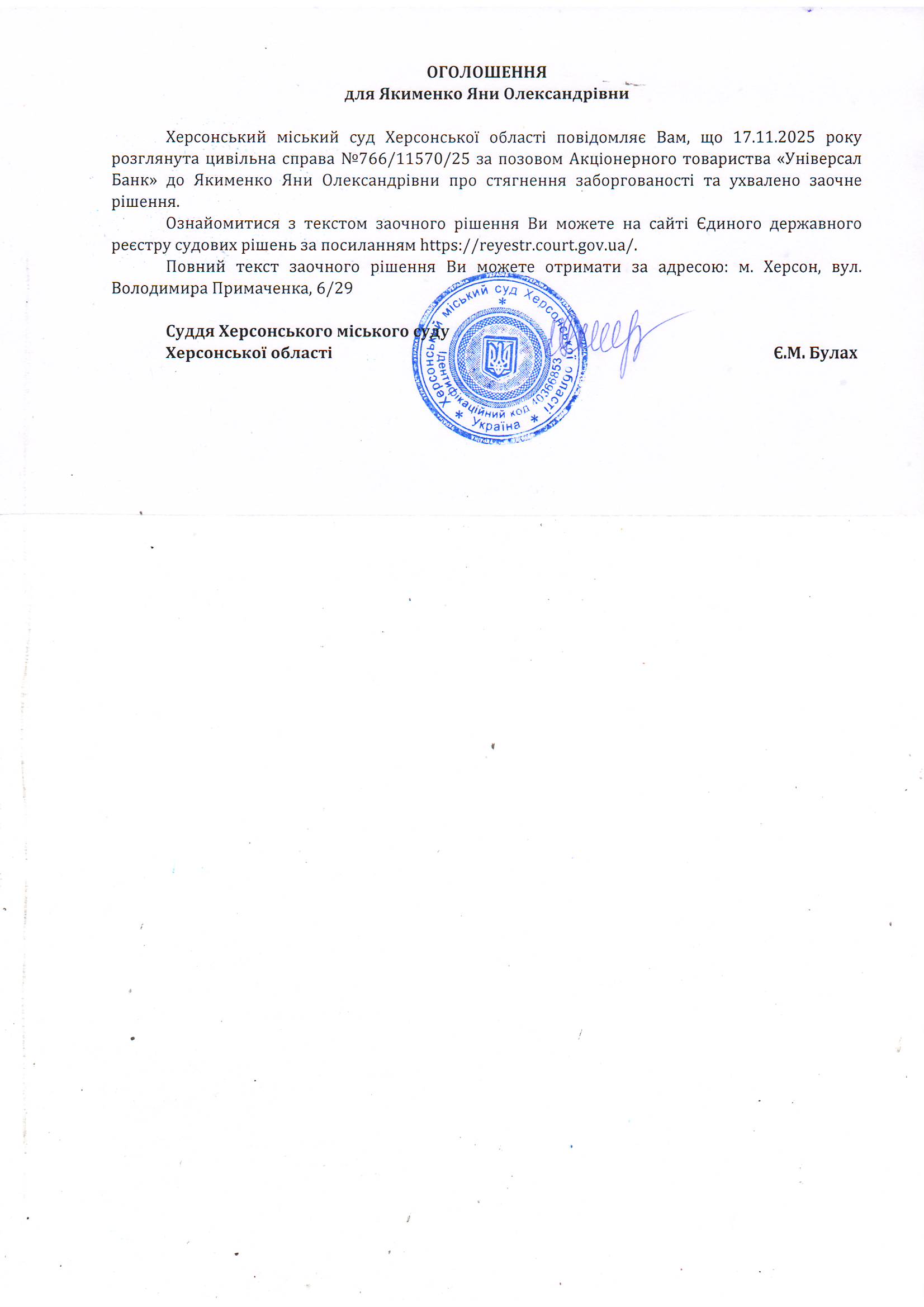 Оголошення для Якименко Яни Олександрівни про ухвалення заочного рішення