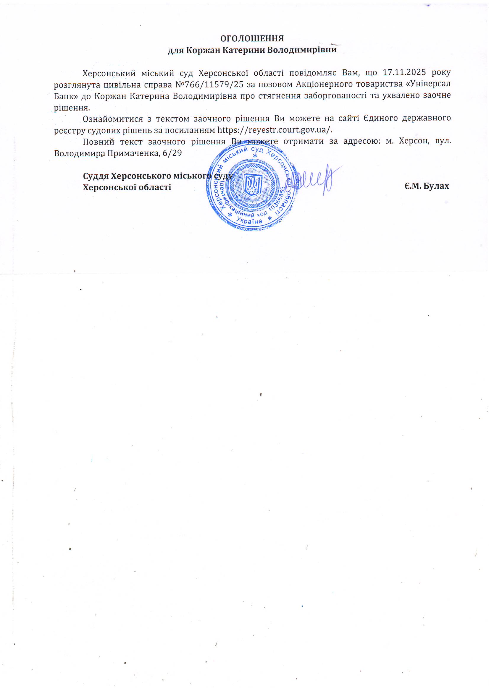 Оголошення для Коржан Катерини Володимирівни про ухвалення заочного рішення