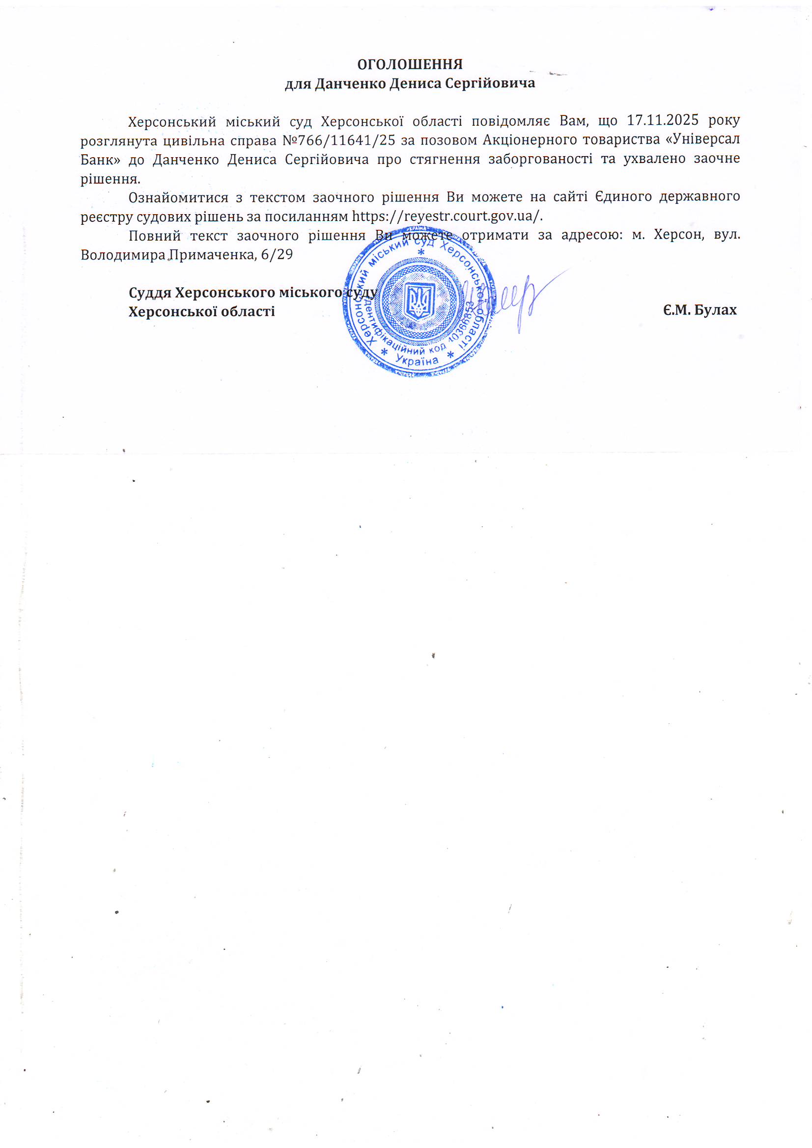 Оголошення для Данченка Дениса Сергійовича про ухвалення заочного рішення
