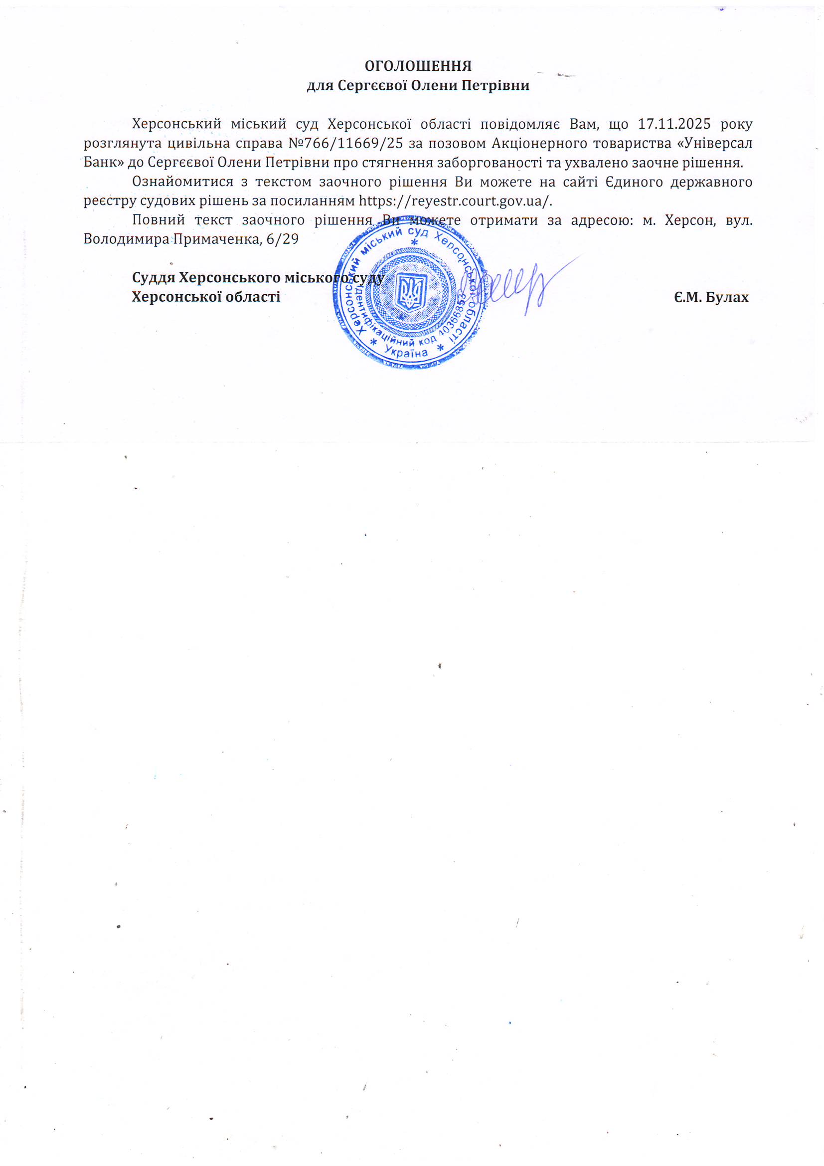 Оголошення для Сергєєвої Олени Петрівни про ухвалення заочного рішення