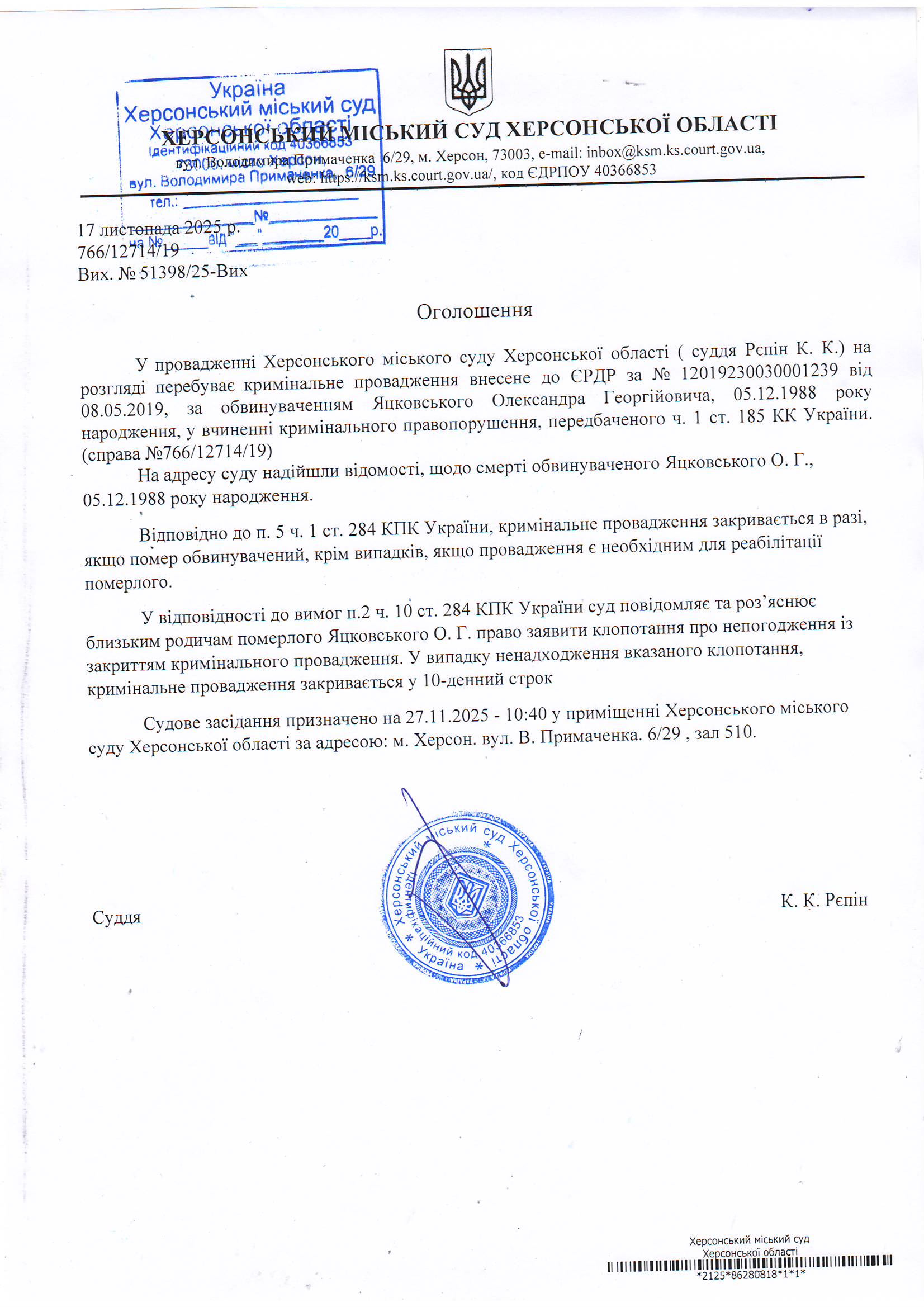 Оголошення про закриття кримінального провадження у відношенні Яцковського Олександра Георгійовича