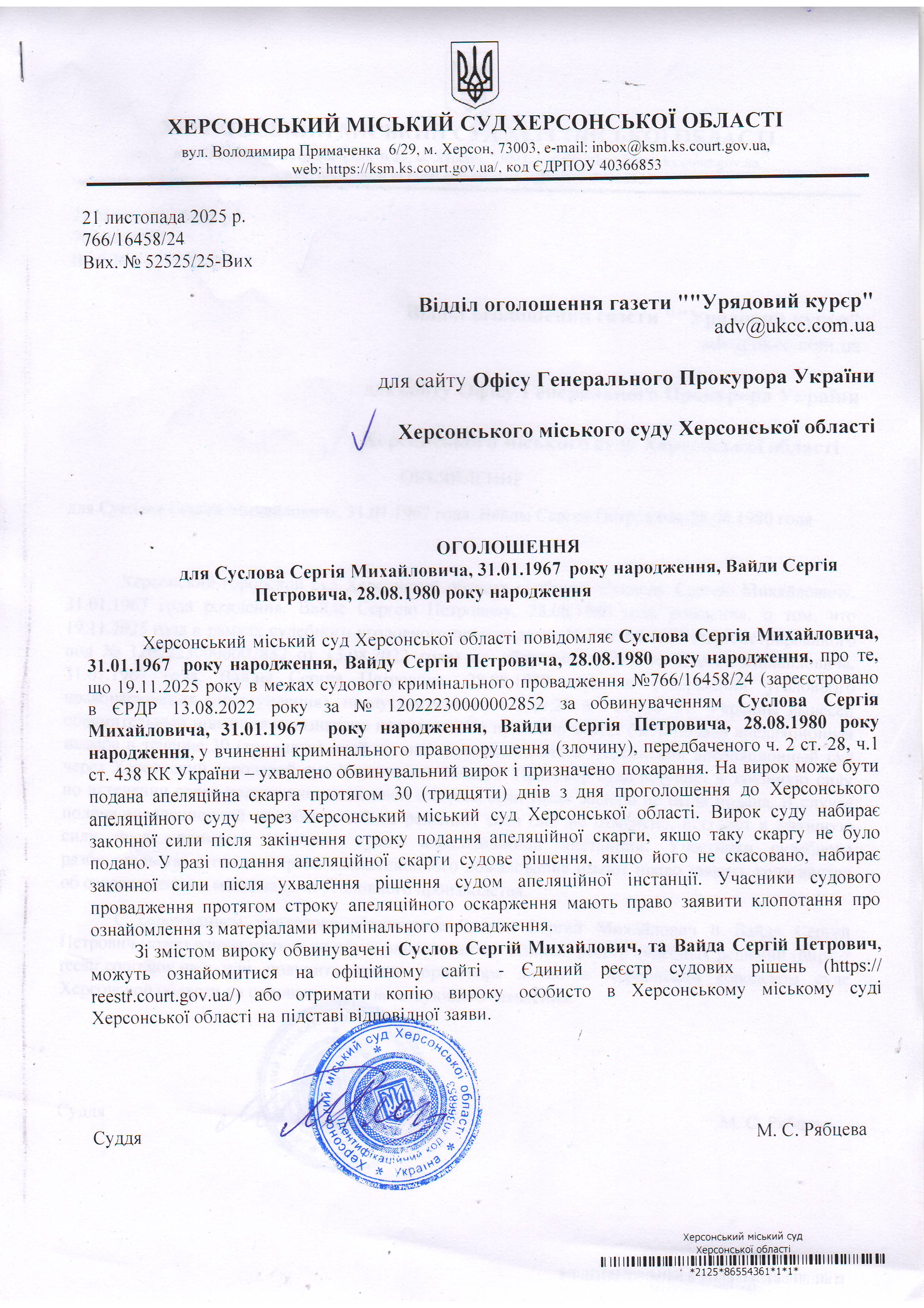 Оголошення для Суслова Сергія Михайловича, Вайди Сергія Петровича про винесення вироку