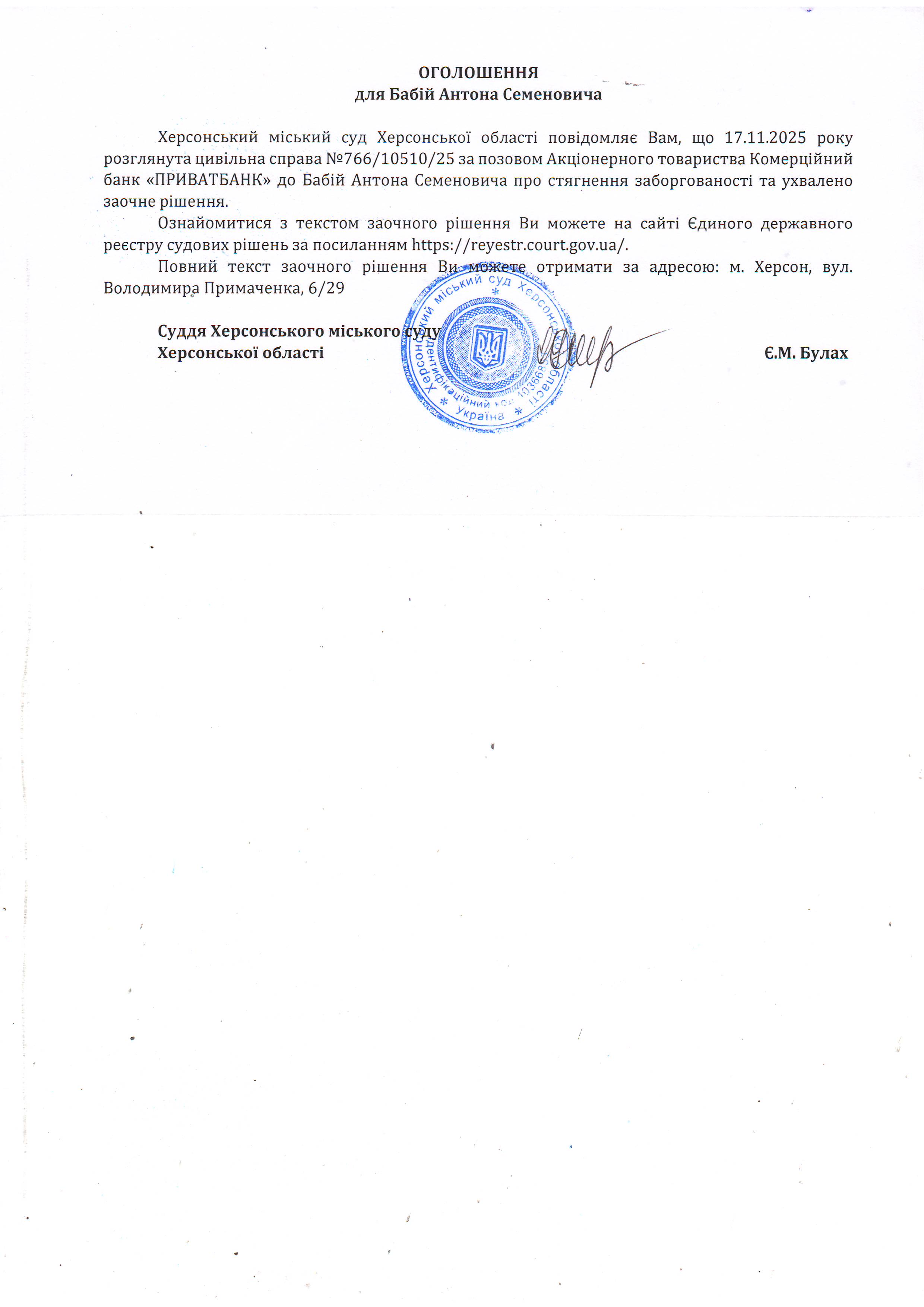 Оголошення для Бабія Антона Семеновича про ухвалення заочного рішення