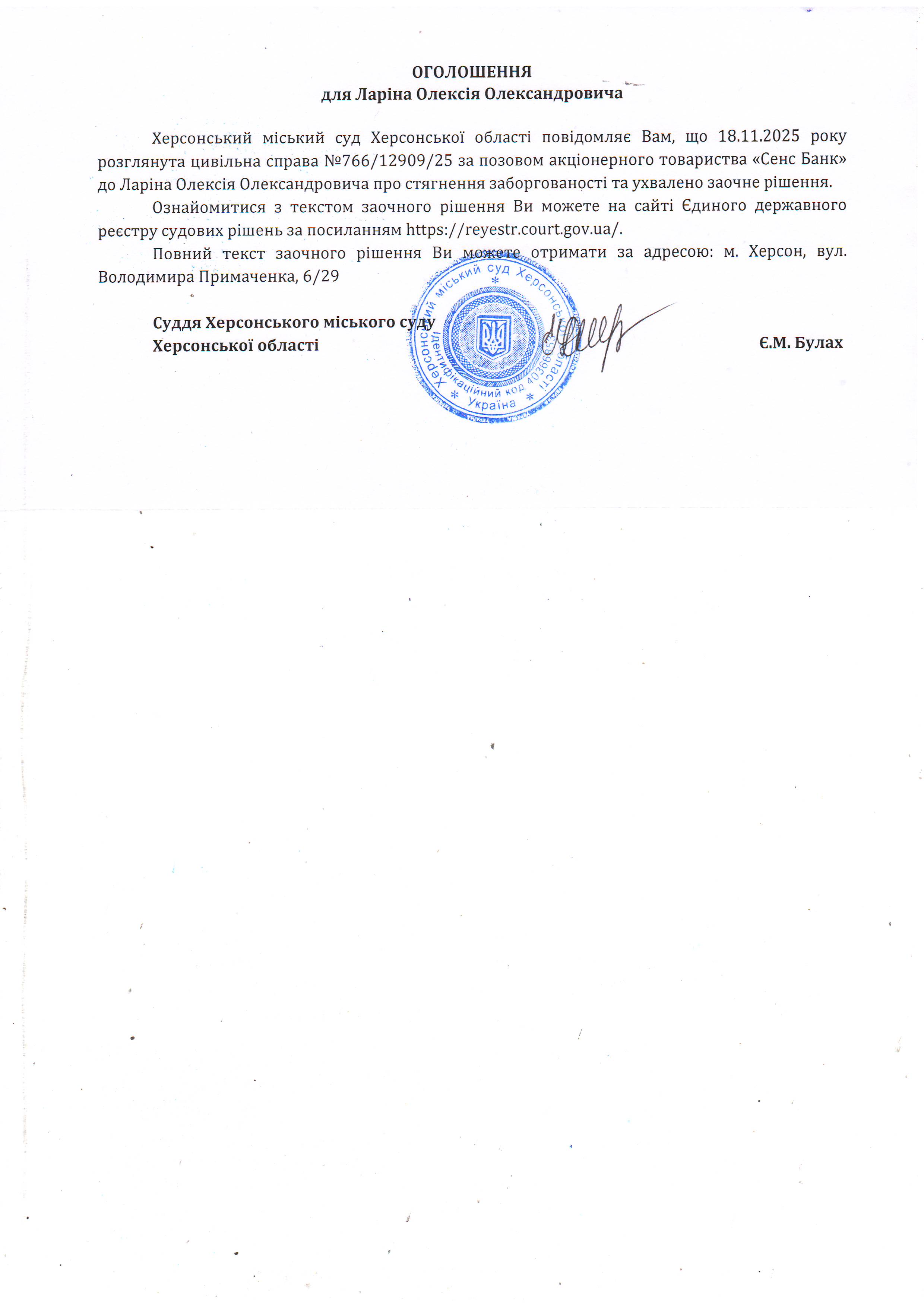 Оголошення для Ларіна Олексія Олександровича про ухвалення заочного рішення