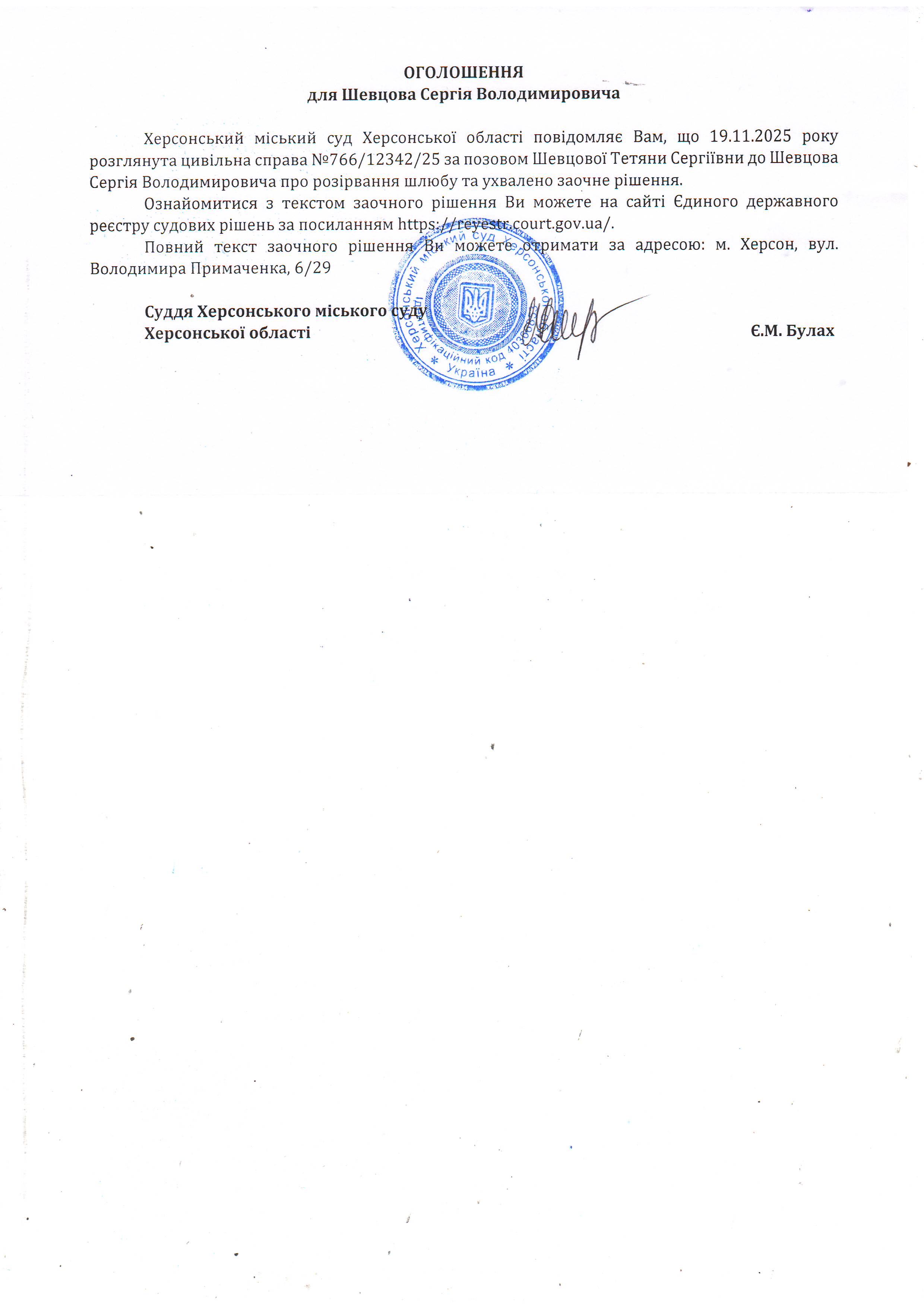 Оголошення для Шевцова Сергія Володимировича про ухвалення заочного рішення