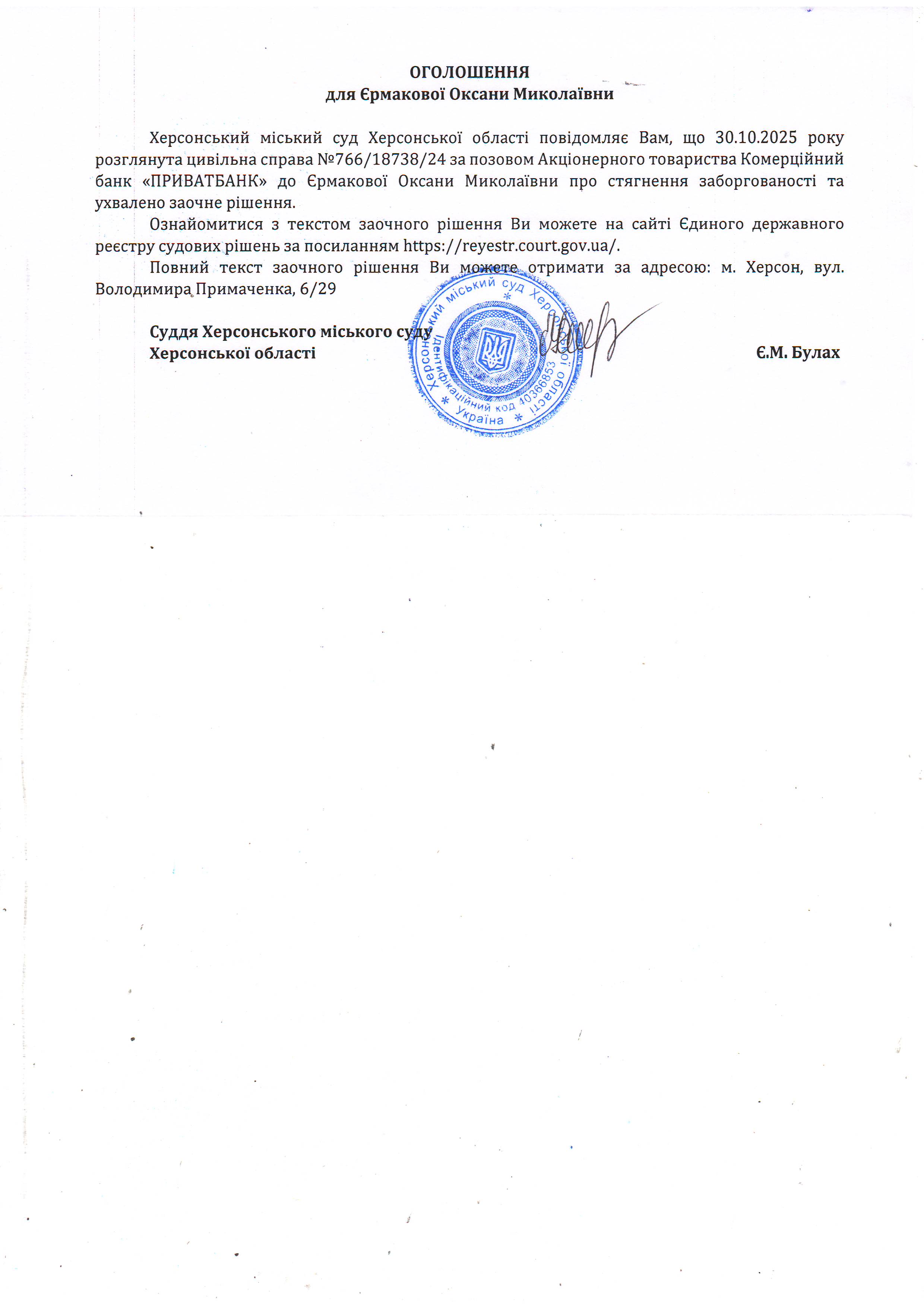Оголошення для Єрмакової Оксани Миколаївни про ухвалення заочного рішення
