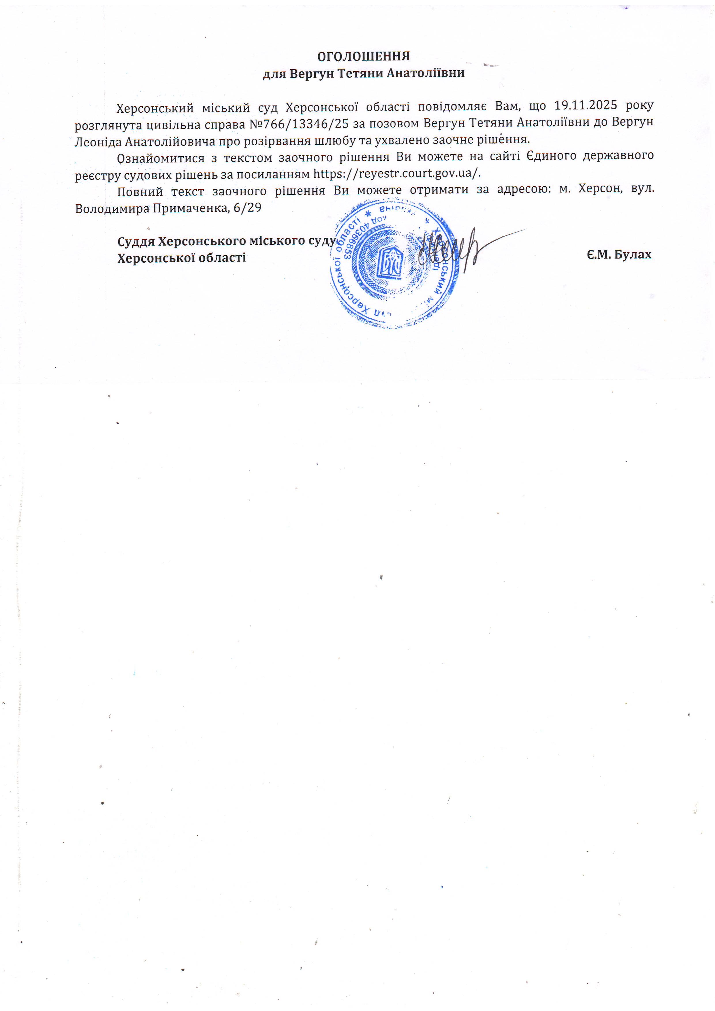 Оголошення для Вергун Тетяни Анатоліївни про ухвалення заочного рішення