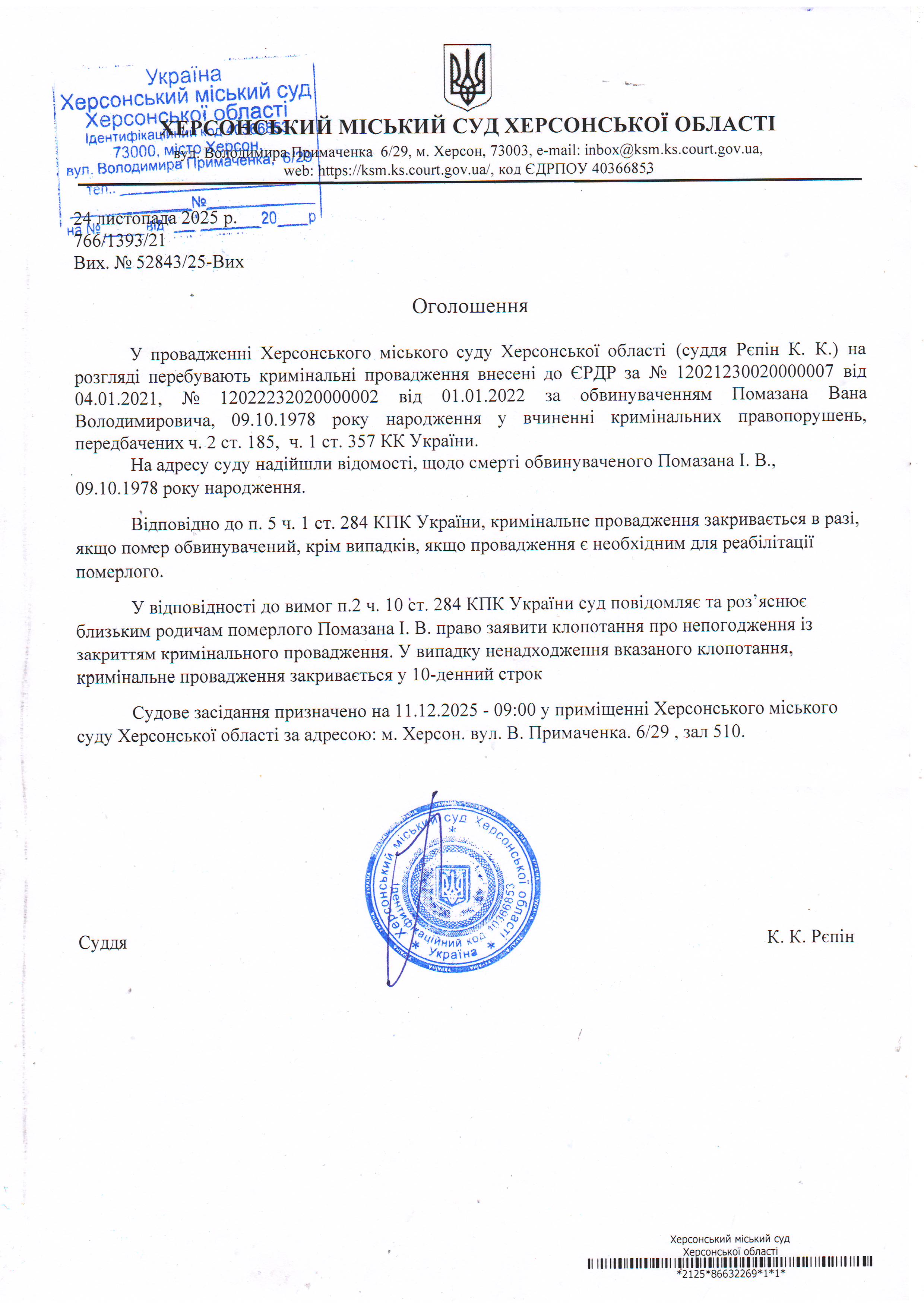 Оголошення про закриття кримінального провадження у відношенні Помазана Вана Володимировича