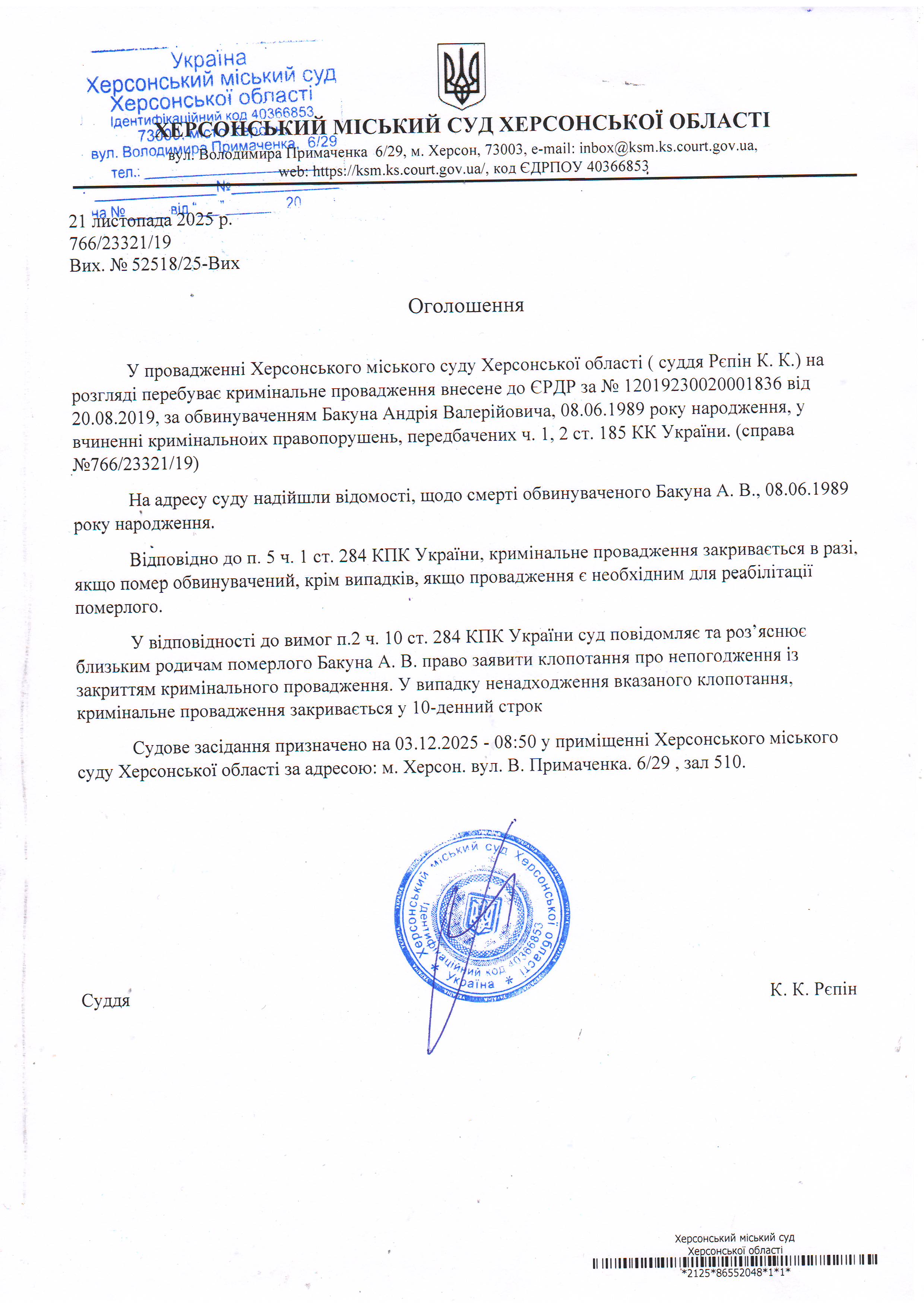 Оголошення про закриття кримінального провадження у відношенні Бакуна Андрія Валерійовича