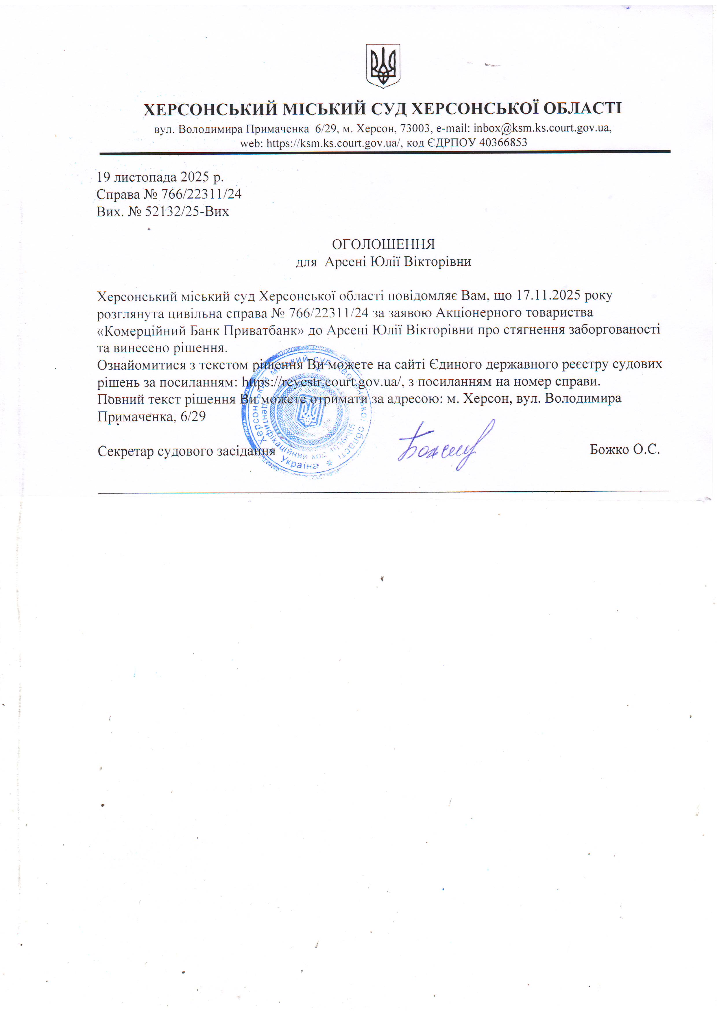 Оголошення для Арсені Юлії Вікторівни про винесення рішення