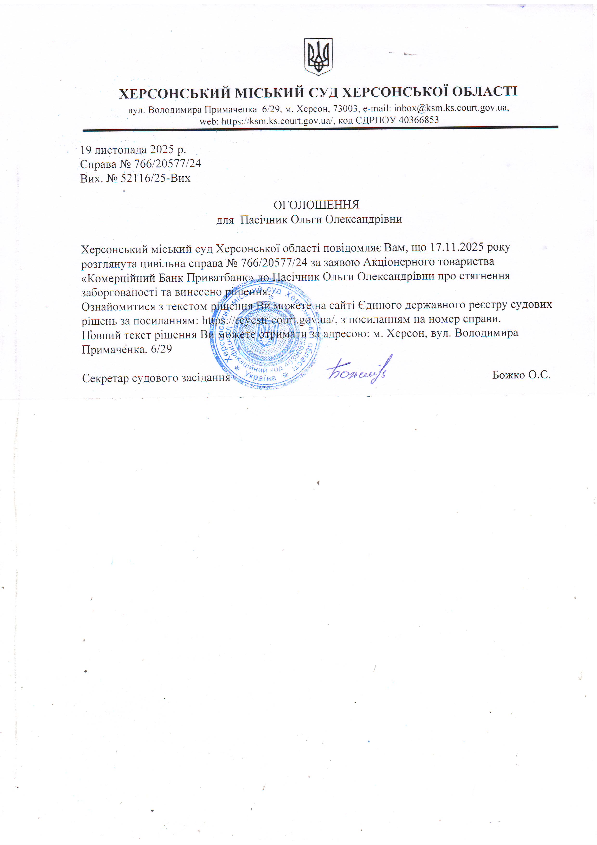 Оголошення для Пасічник Ольги Олександрівни про винесення рішення