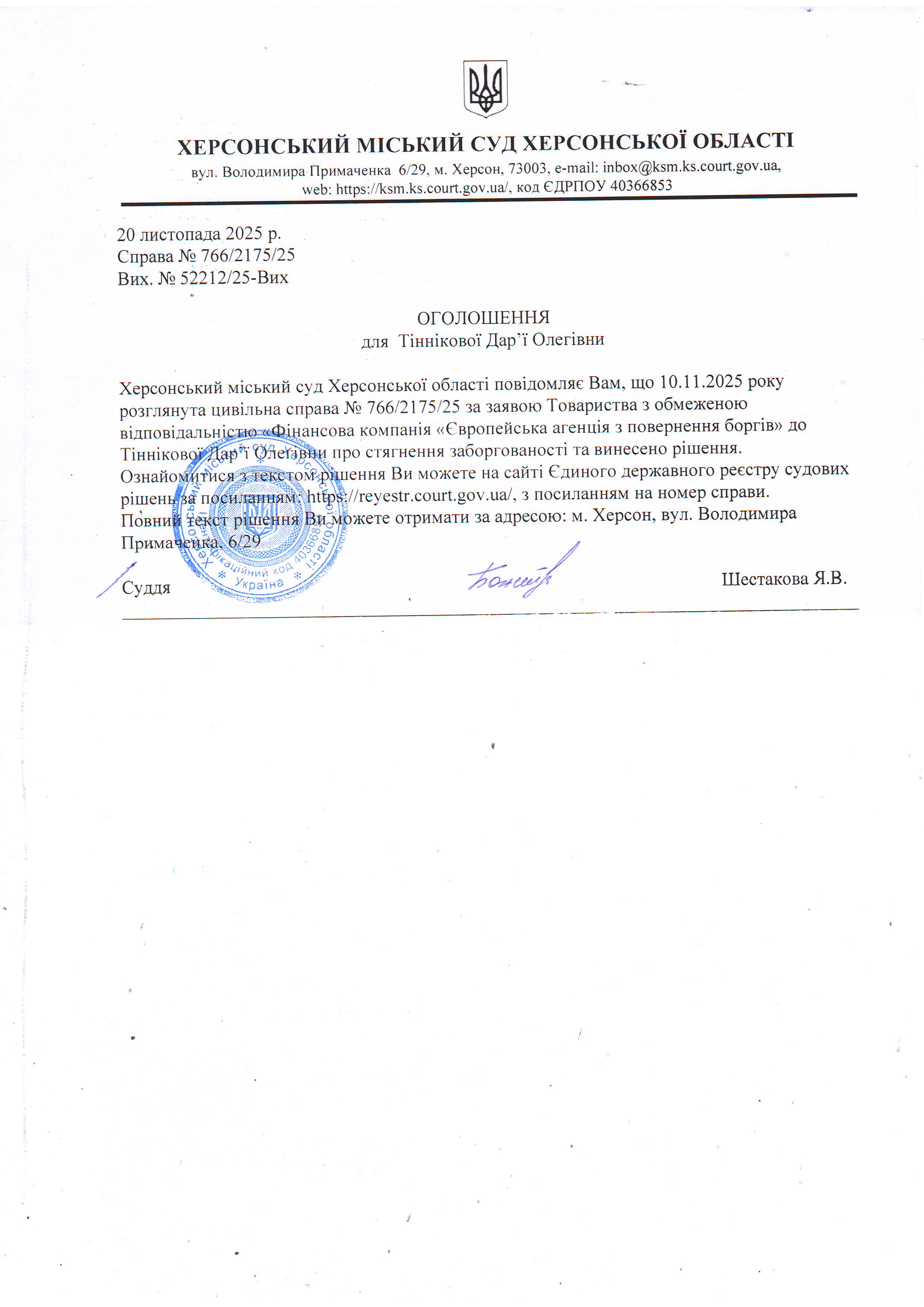 Оголошення для Тіннікової Дар'ї Олегівни про винесення рішення