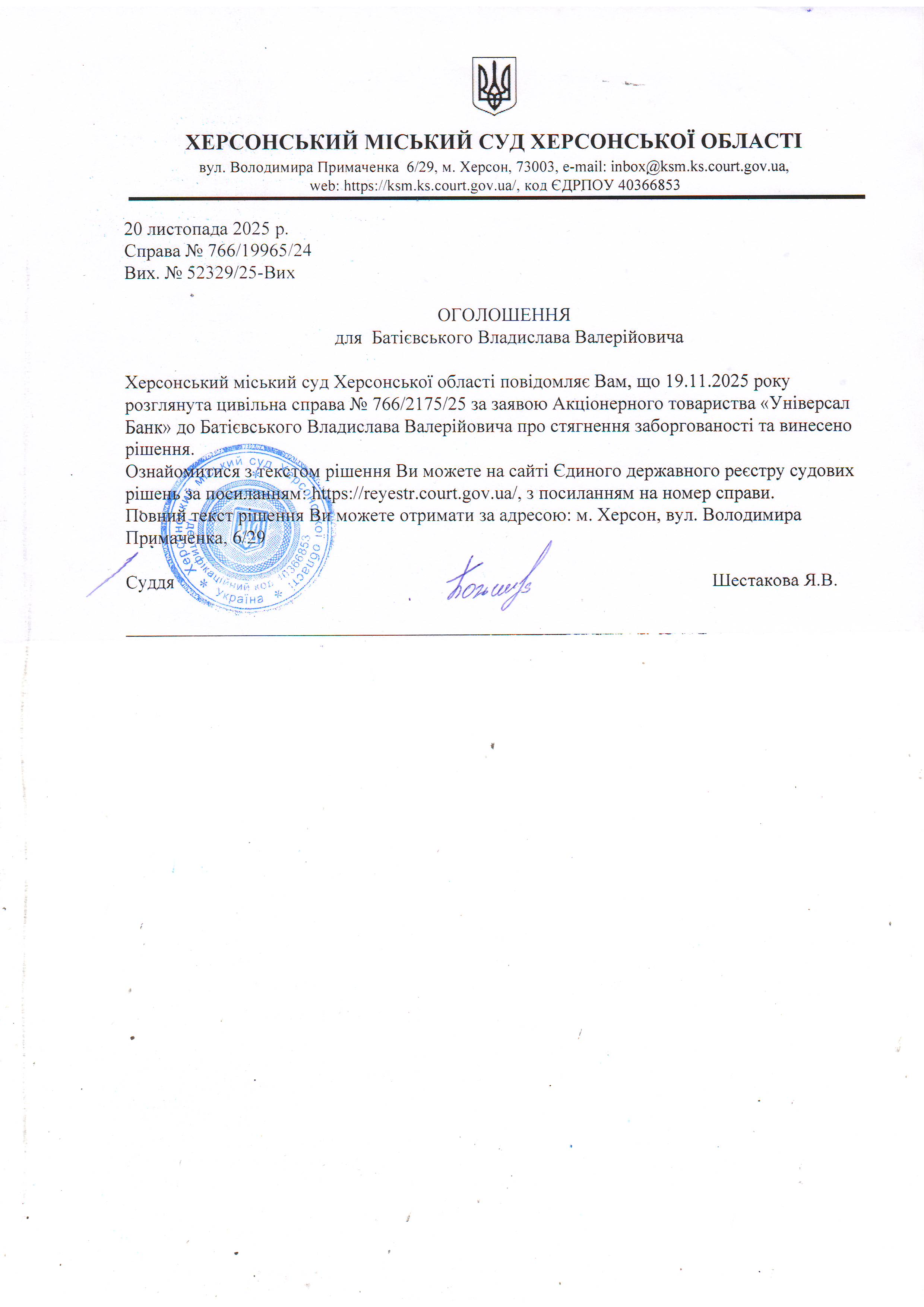 Оголошення для Батієвського Владислава Валерійовича про винесення рішення