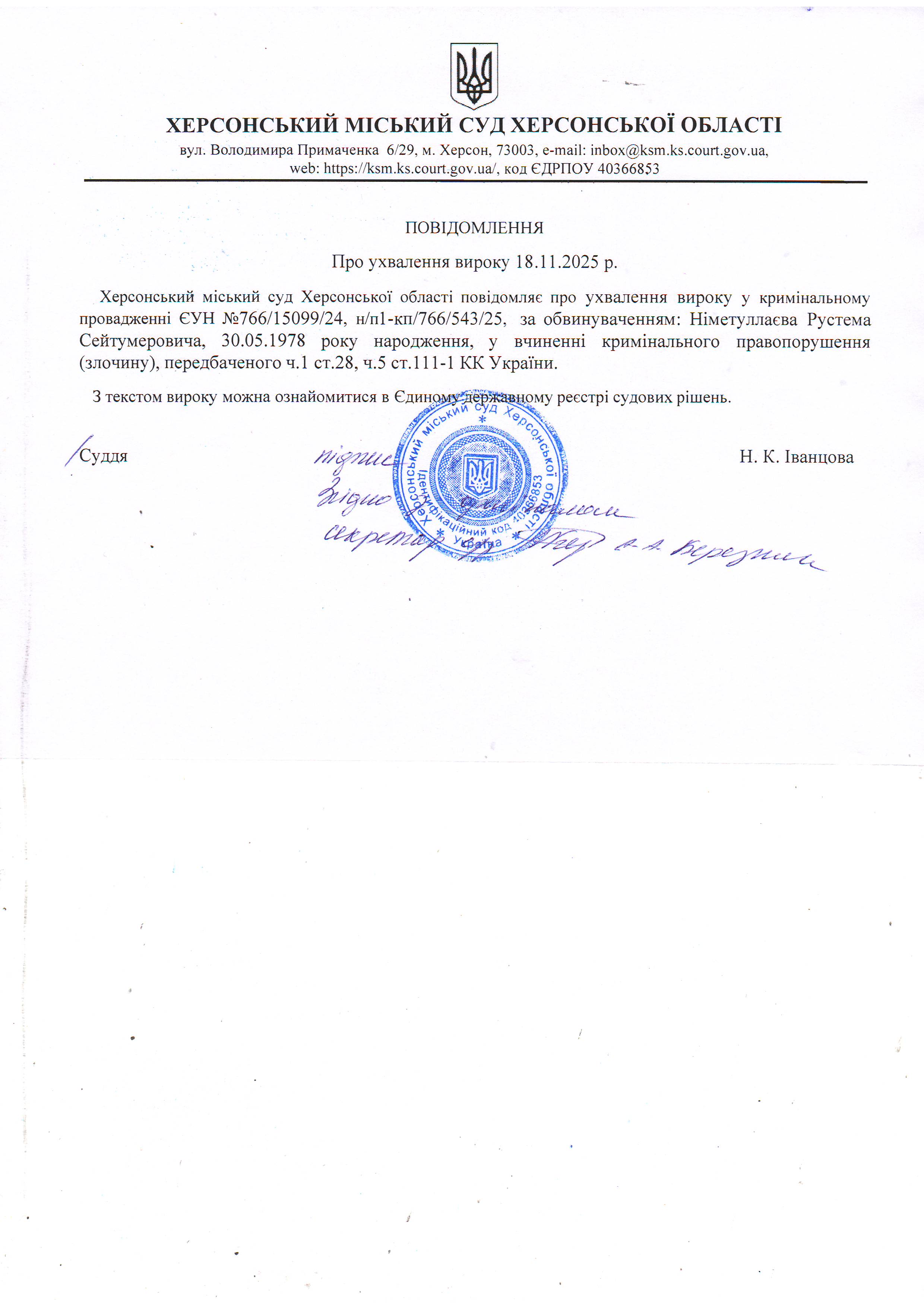 Оголошення для Німетуллаєва Рустема Сейтумеровича про ухвалення вироку