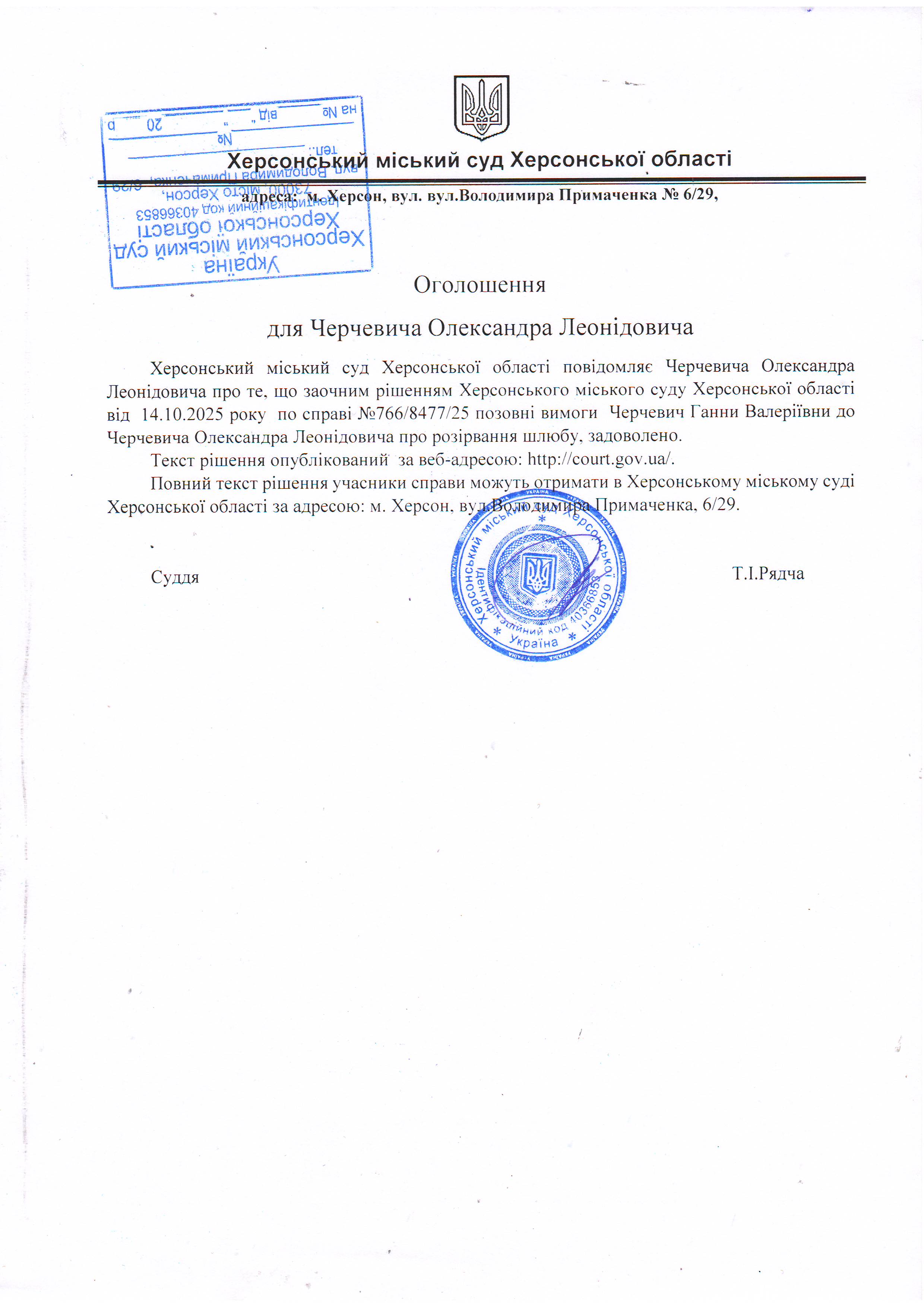 Оголошення про виклик особи в суд та повідомлення про судове рішення