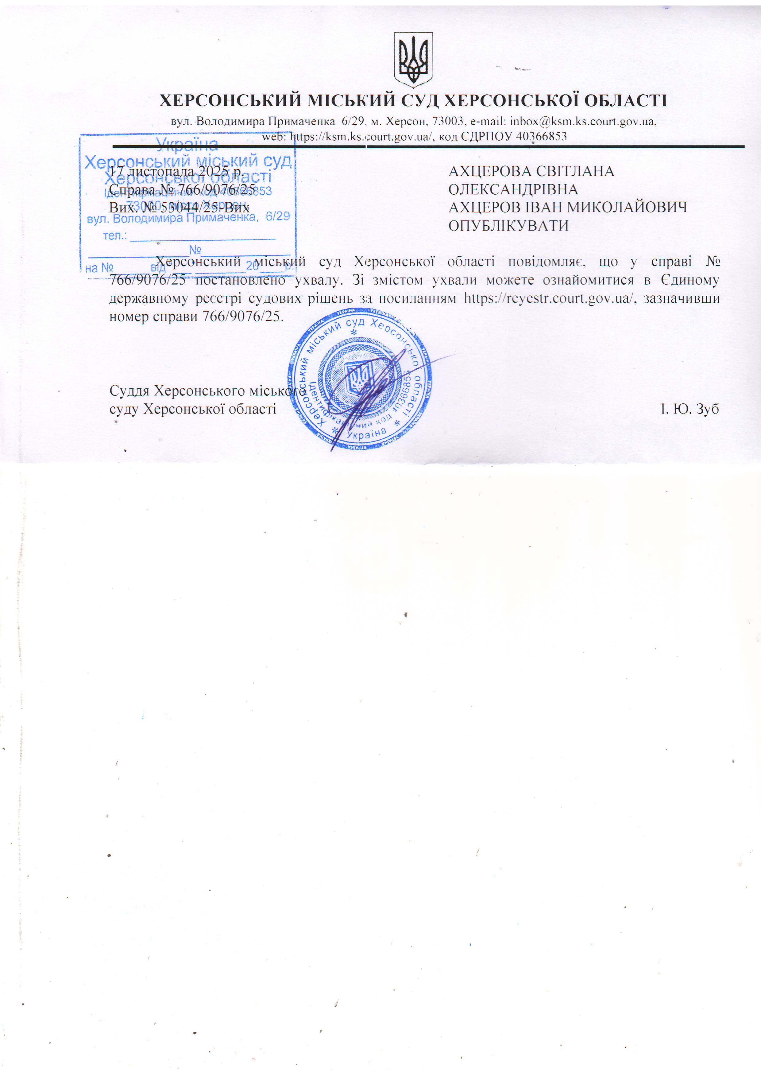 Оголошення для Ахцерової Світлани Олександрівни, Ахцерова Івана Миколайовича про постановлення ухвали
