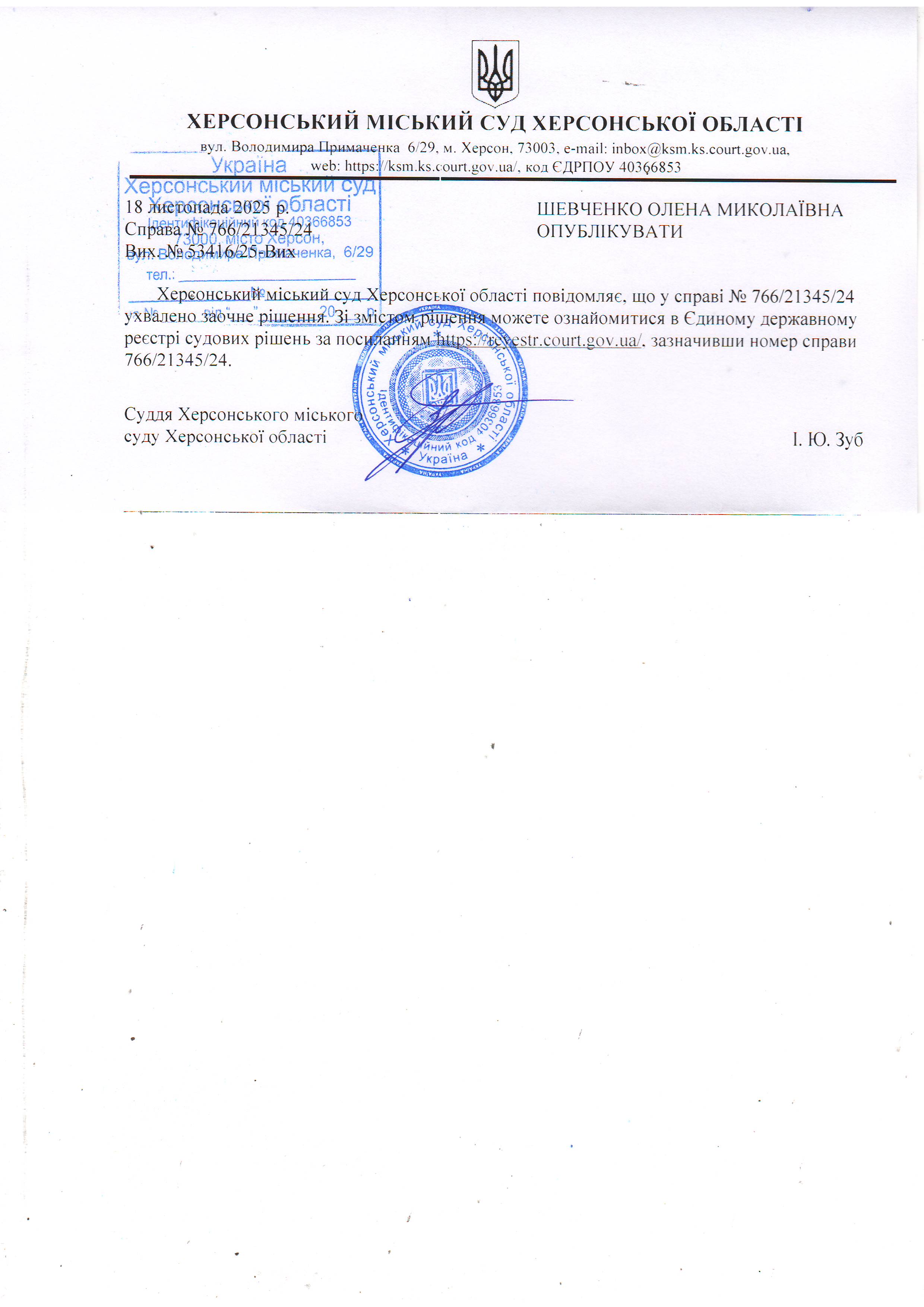 Оголошення для Шевченко Олени Миколаївни про ухвалення заочного рішення