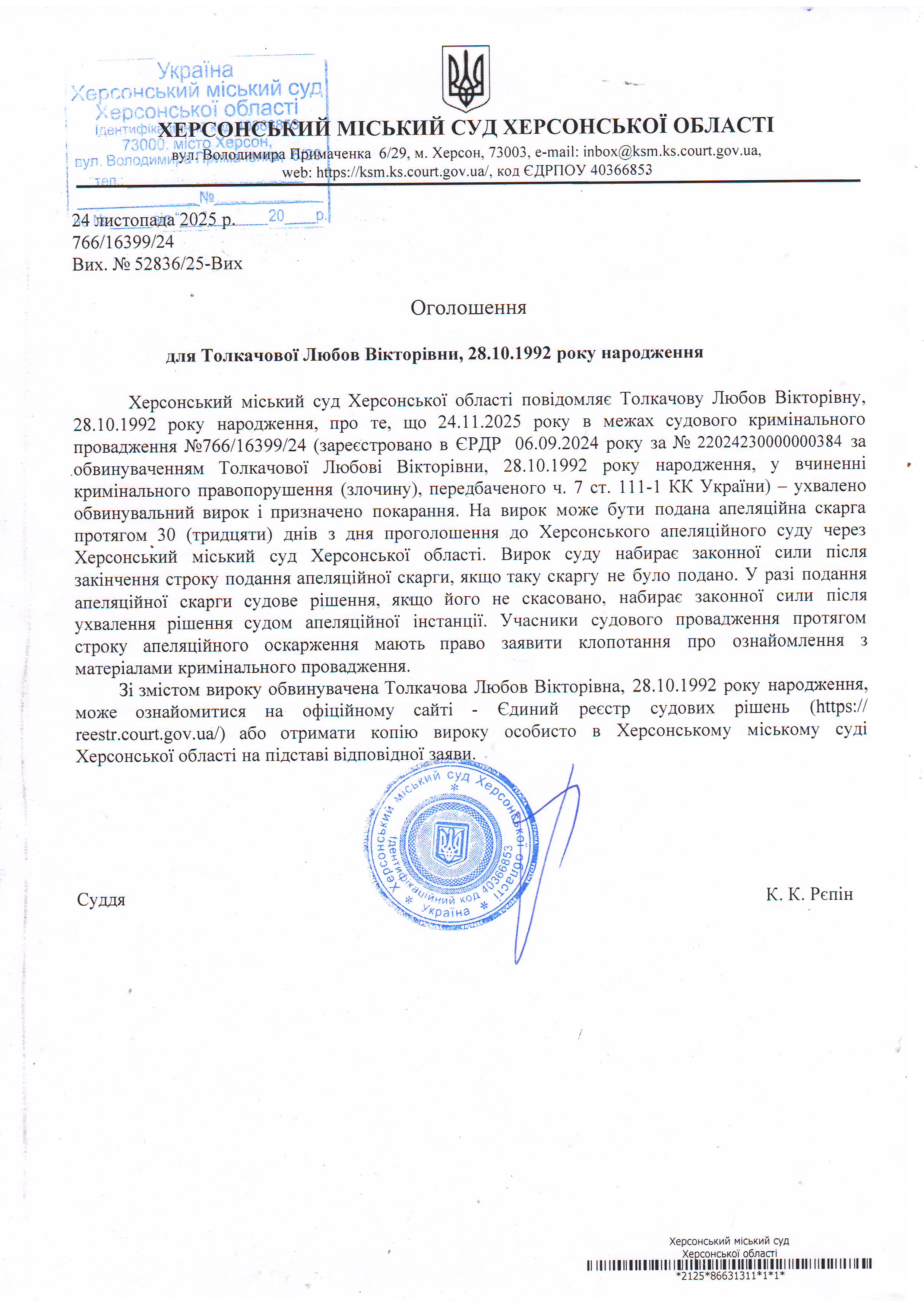 Оголошення для Толкачової Любові Вікторівни про винесення вироку