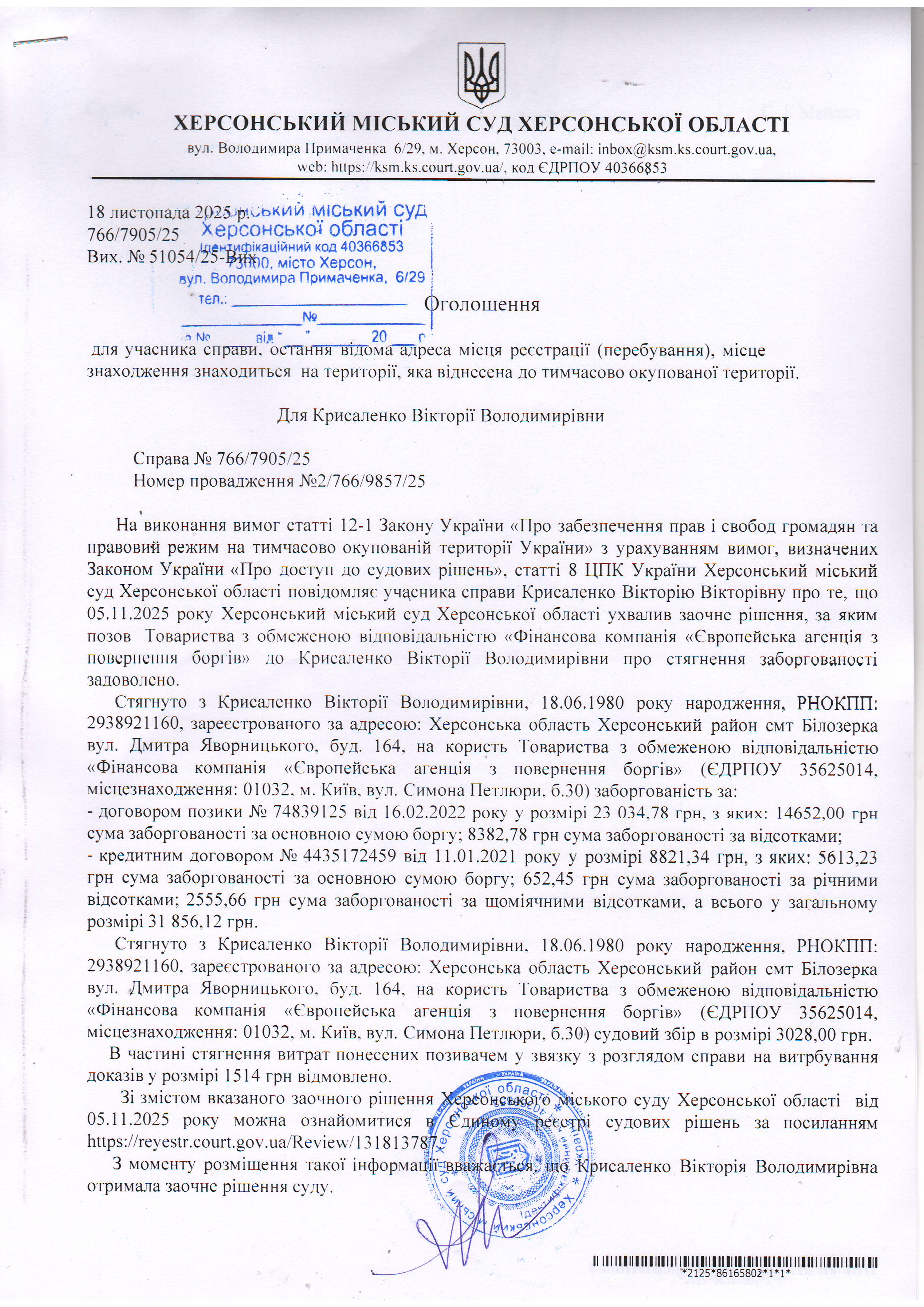 Оголошення для Крисаленко Вікторії Володимирівни про ухвалення заочного рішення