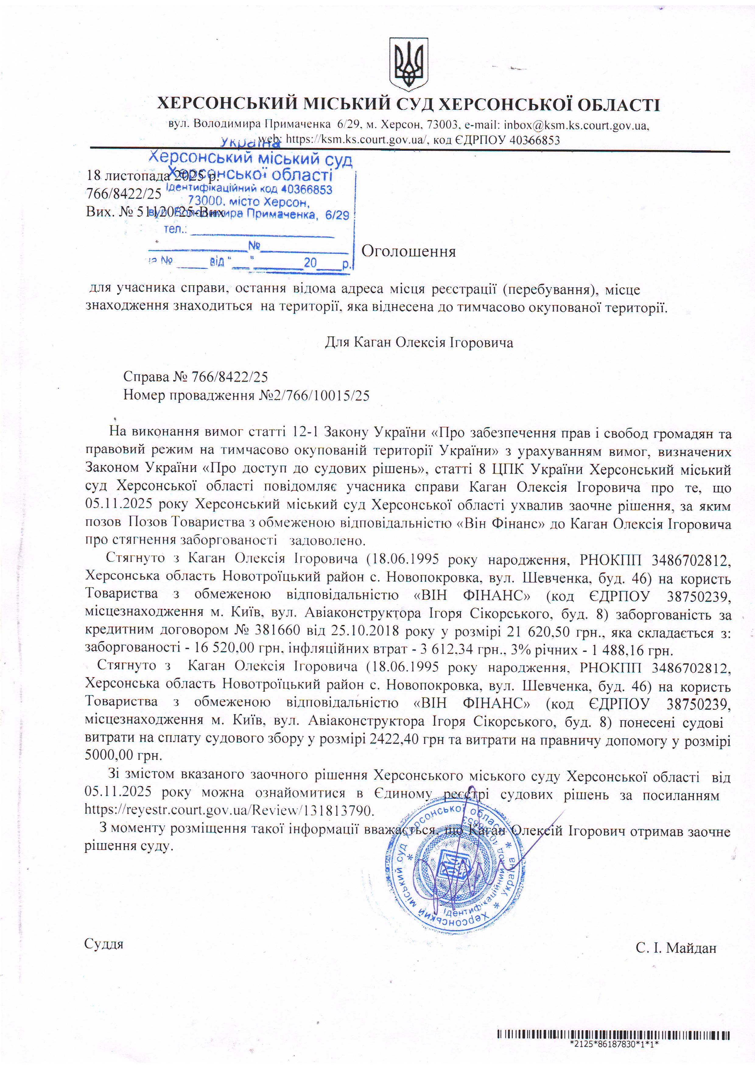 Оголошення для Кагана Олексія Ігоровича про ухвалення заочного рішення