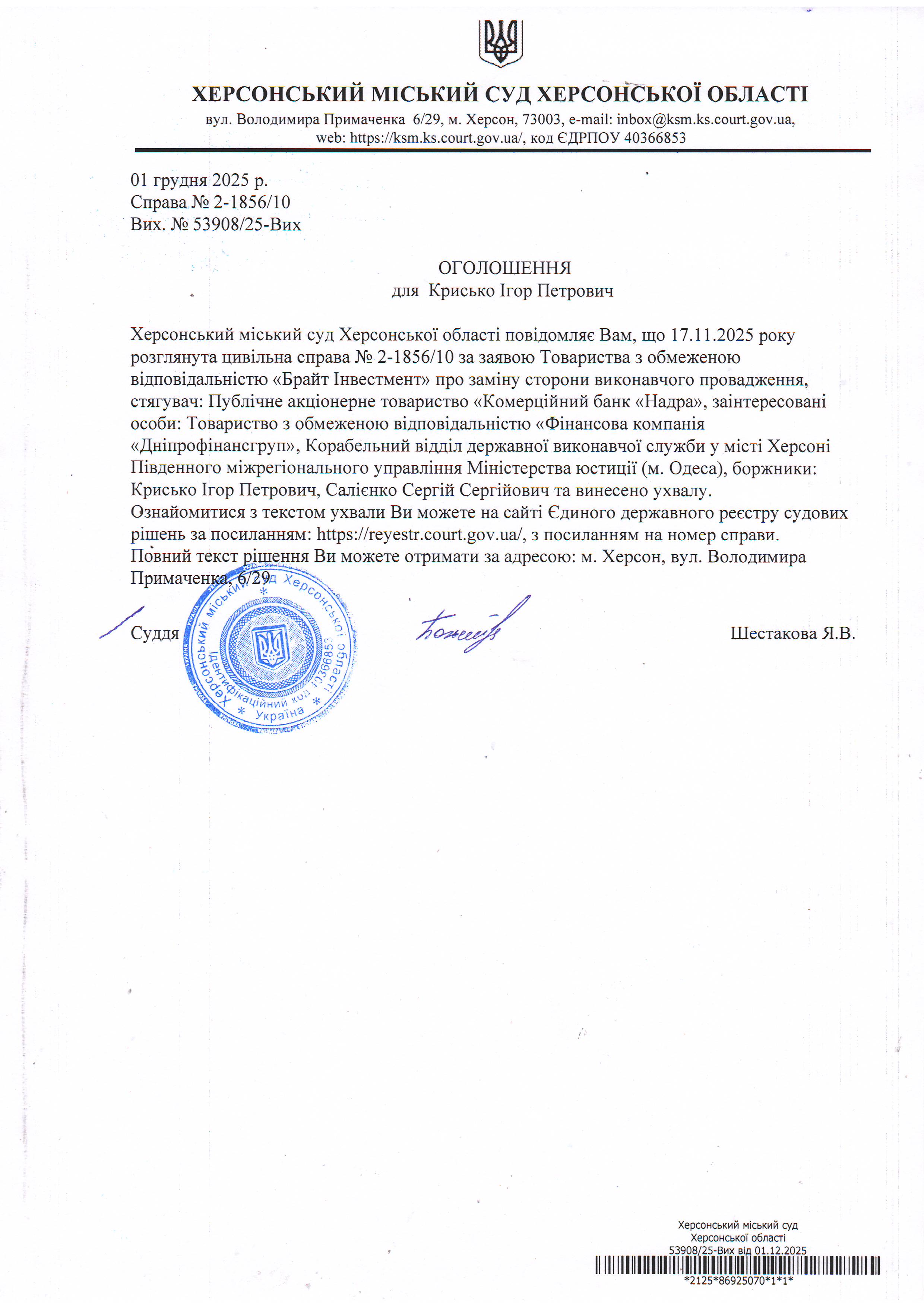 Оголошення для Криська Ігоря Петровича про винесення ухвали