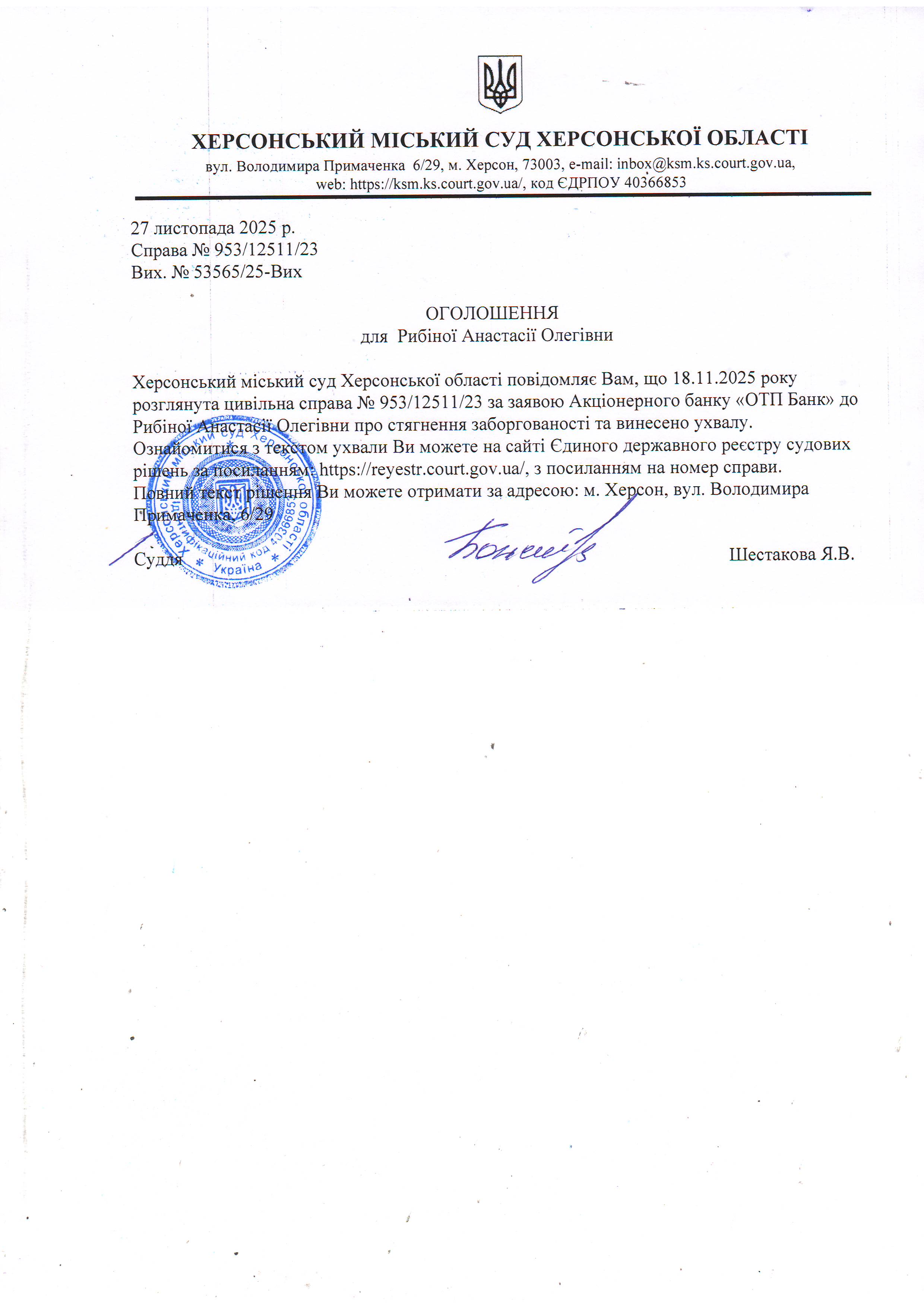 Оголошення для Рибіної Анастасії Олегівни про винесення ухвали
