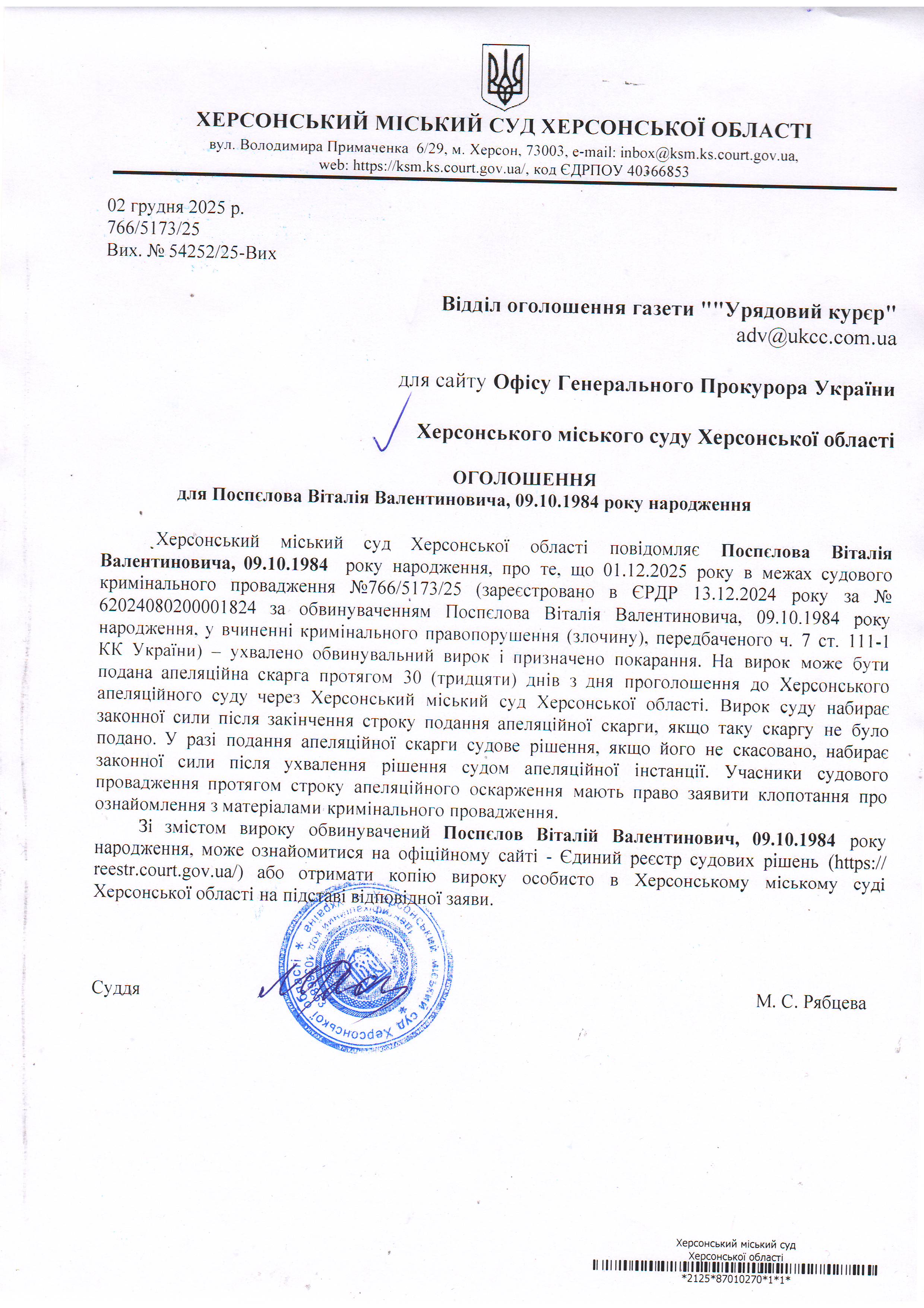 Оголошення для Поспєлова Віталія Валентиновича про винесення вироку