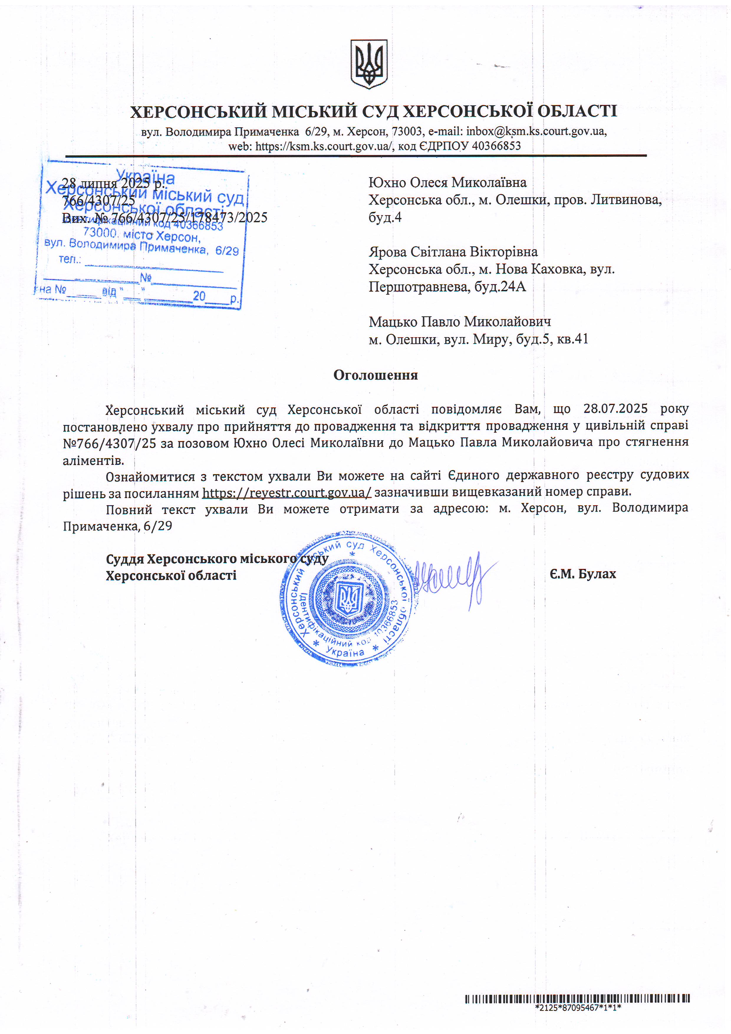 Оголошення для Юхно Олесі Миколаївни, Ярової Світлани Вікторівни, Мацька Павла Миколайовича