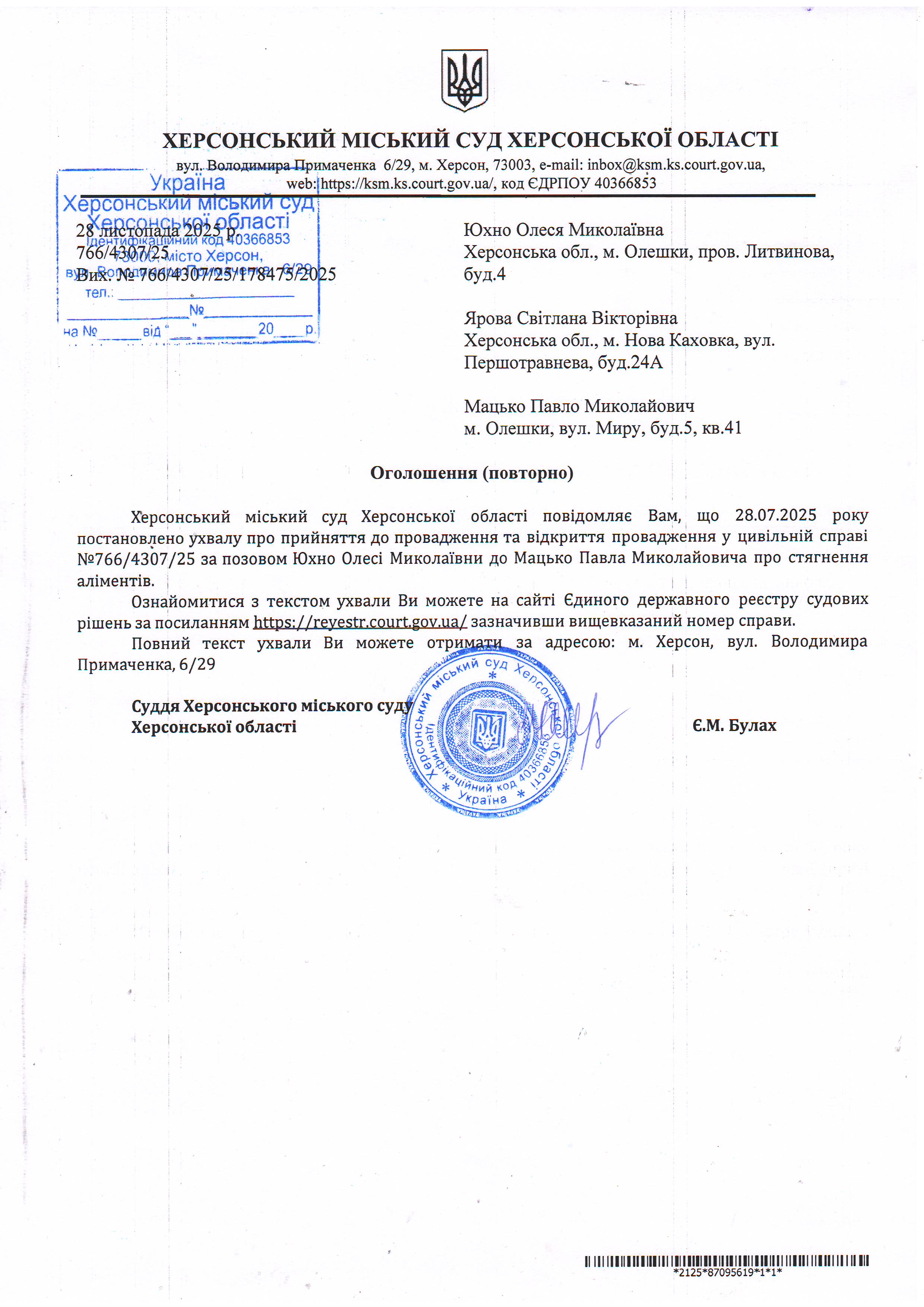 Оголошення для Юхно Олесі Миколаївни, Ярової Світлани Вікторівни, Мацька Павла Миколайовича